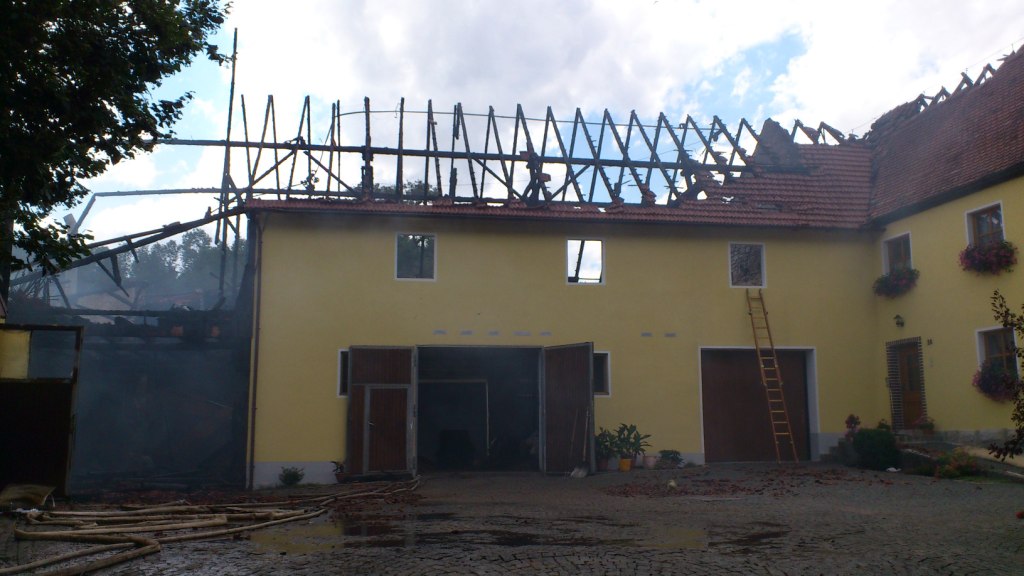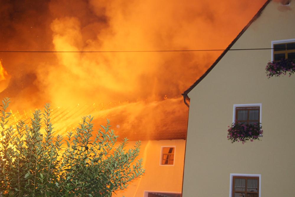 Dauer: 6,25 Std Einsatzdokumentation: Mittels Sirene und Funkmeldeempfänger wurde die FF Heiligenstadt zu einem Brand eines landwirtschaftlichen Anwesens im Ortsteil Oberleinleiter gerufen. Alarmspruch: "Alarm für die Feuerwehren Oberleinleiter, Heiligenstadt, Ebermannstadt und Umgebung...." Schon bei der Anfahrt war die Rauchsäule und der hell erleuchtete Himmel zu sehen. Beim Eintreffen befand sich eine Lagerhalle in Vollbrand - die Flammen schlugen meterhoch aus dem Gebäude. Der Dachstuhl und das obere Geschoss des direkt angebauten Stalles brannte bereits au - ebenso der Dachstuhl des anschließenden Wohnhauses. Die insgesamt 17 Feuerwehren konzentrierten sich zunächst auf die Rettung des Viehs und auf das Halten des Wohnhauses und der benachbarten Gebäude. Da die Leinleiter keine 100m vom Einsatzort entfernt fließt, gab es keine Probleme mit der Wasserversorgung. Gott sei Dank gab es keinen Personenschaden (2 Personen wurden vorsorglich ins Krankenhaus gebracht, waren jedoch am nächsten Morgen wieder zu Hause), lediglich 2 Rinder verendeten in den Flammen. Ein weiteres Rind musste am Folgetag geschlachtet werden. Laut Einsatzleiter, KBR B. Ziegmann, waren über 250 Einsatzkräfte vor Ort. Im einzelnen: 228 Feuerwehrkameradinnen und -kameraden (darunter KBI R. Schumm, KBI J. Farniol, KBI F. Riemer, KBM; S. Kormann, KBM B. Schlicht, KBM K. Schmaus und KBM J. Eberlein), 15 Mitglieder des Rettungsdienstes (Rotes Kreuz und Malteser) und 11 Personen der UG-ÖEL. Außerdem war die Polizei mit mehreren Beamten an der Einsatzstelle, ebenso wie die UF-ÖEL Bamberg-Land, das Atemschutzzentrum Strullendorf, Mitarbeiter des Landratamtes und 2 Tierärzte. Der Brandgeruch verteilte sich auf Grund der Wetterlage im ganzen Leinleitertal. Sogar im ca. 10 km entfernten Ebermannstadt riefen besorgte Bürger bei der Polizei an und meldeten Brandgeruch! Einige Feuerwehren übernahmen die Brandwache. Am Folgetag gegen 07.00 Uhr wurden sie abgelöst. (siehe "Der Tag danach")
