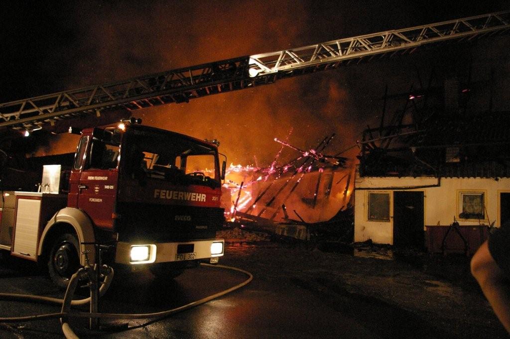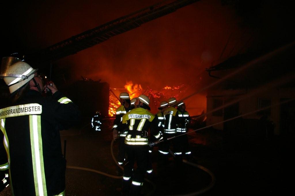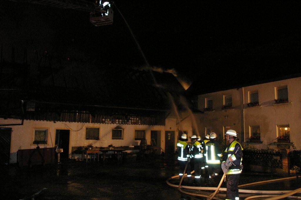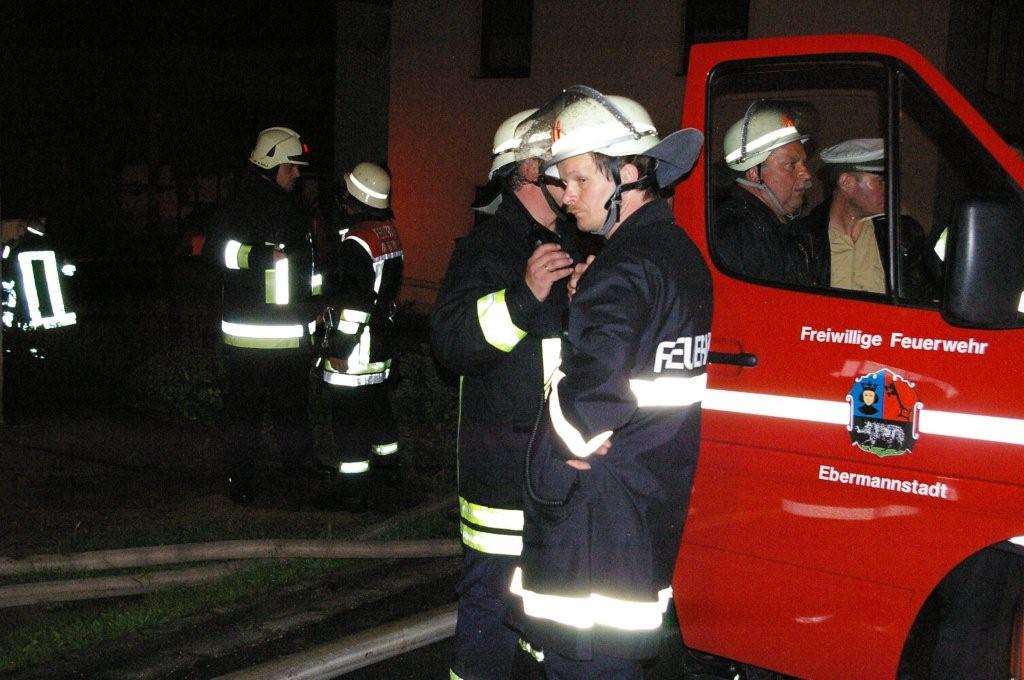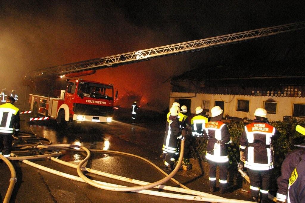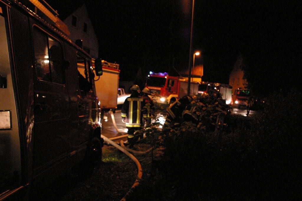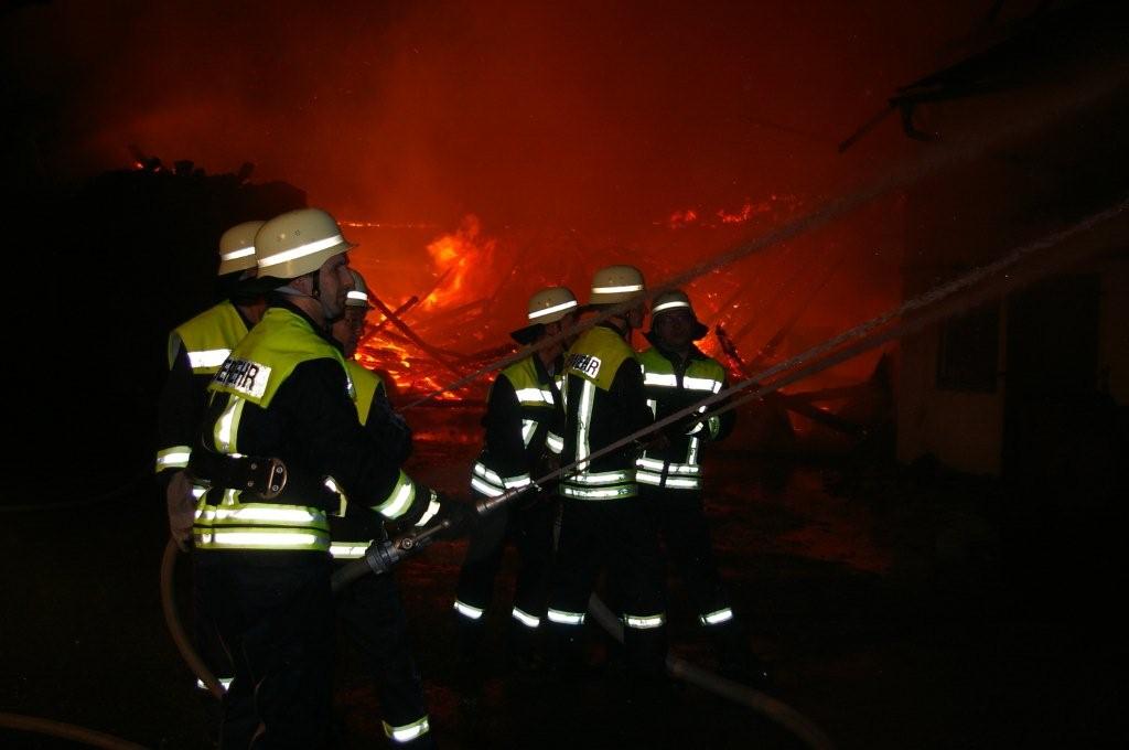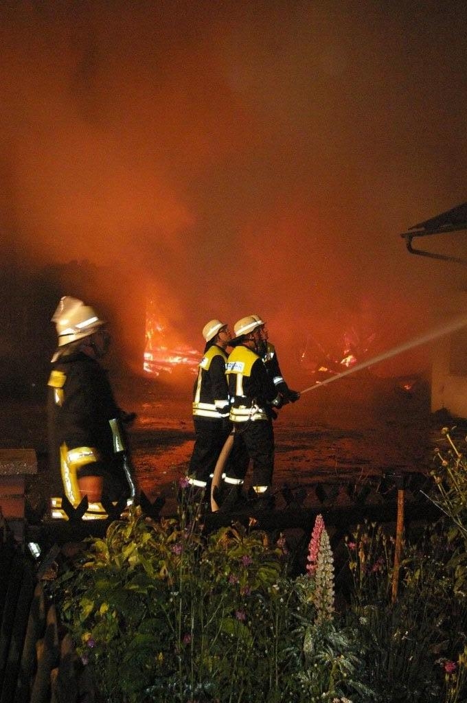 Dauer: 4 Std Einsatzdokumentation: Durch Sirene und Funkwecker wurde die FF Heiligenstadt alarmiert. In Störnhof (Gemeinde Wiesenttal, Lkr. Forchheim) brennt eine Scheune. Schon bei der Anfahrt war der Feuerschein weit sichtbar - das bzw. die Gebäude befanden sich bereits im Vollbrand. Die Löschwasserversorgung war bereits aufgebaut und verschiedene Wehren im Einsatz. Wasser wurde aus dem Löschwasserbehälter in Störnhof und über eine 1,2 km lange Schlauchleitung aus dem Behälter in Oberfellendorf bezogen. Mit den Tanklöschfahrzeugen wurde ein Pendelverkehr zur Wiederbefüllen der Behälter durchgeführt. Zusätzlich beteiligten sich einige Bauern mit ihren Güllefässern am Wassertransport. Bei dem schweren Gewitter schlug ein Blitz kurz nach 1 Uhr in eine 250 m² große Maschinenhalle ein und setzte sie in Brand. Beim Eintreffen der ersten Feuerwehren hatte das Feuer bereits auf die 150 m² große Stallung übergegriffen. Ca 30 Kühe und Kälber wurden aus dem brennenden Gebäude geholt. Durch Hitze und Feuer wurden zwei Wohngebäude ebenfalls in Mitleidenschaft gezogen. Vier Personen wurden verletzt (drei mit Rauchvergiftung und Schock, ein Helfer zog sich leichte Verletzungen bei Einfangen der Kühe zu) und vom Rettungsdienst ins Krankenhaus gebracht. Es entstand ein Sachschaden von rund 150.000 €. Es waren über 200 Feuerwehrleute im Einsatz! Weitere Infos/Bilder: Bericht TV-Oberfranken Bilder FF Ebermannstadt Bilder FF Kirchehrenbach Danke den Kameraden von Ebermannstadt und Kirchehrenbach für die Bilder!