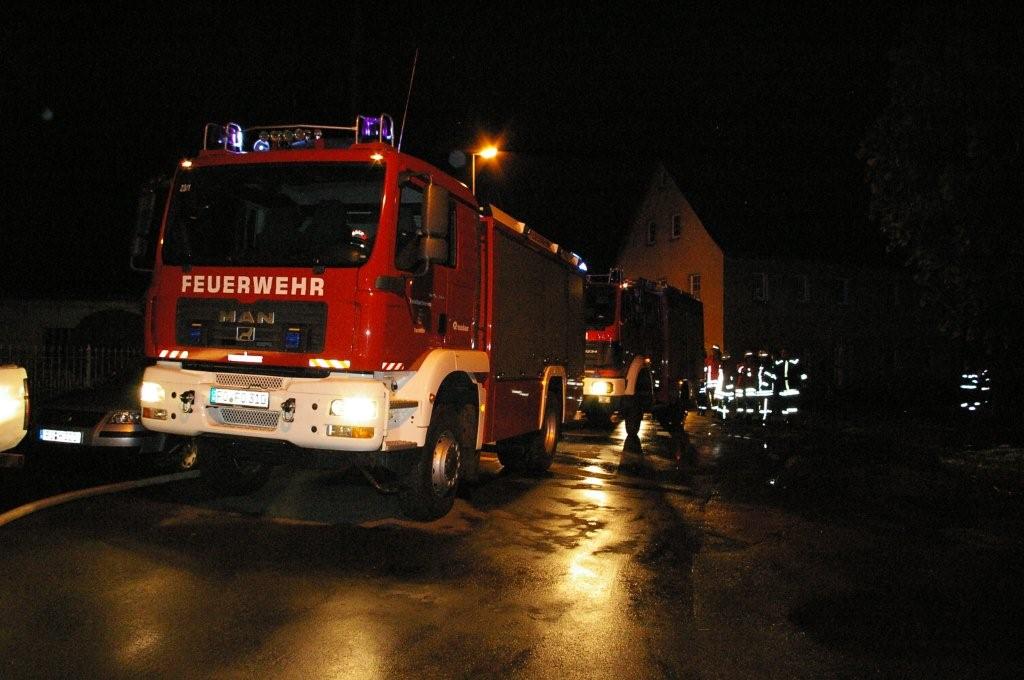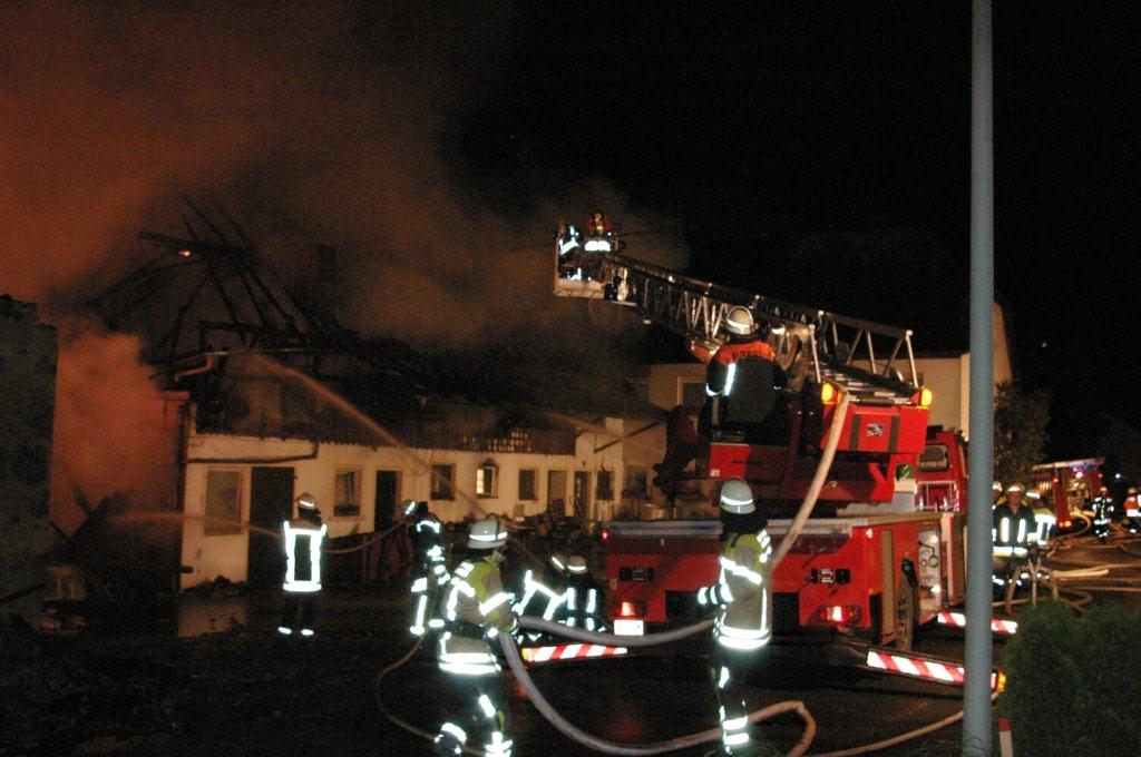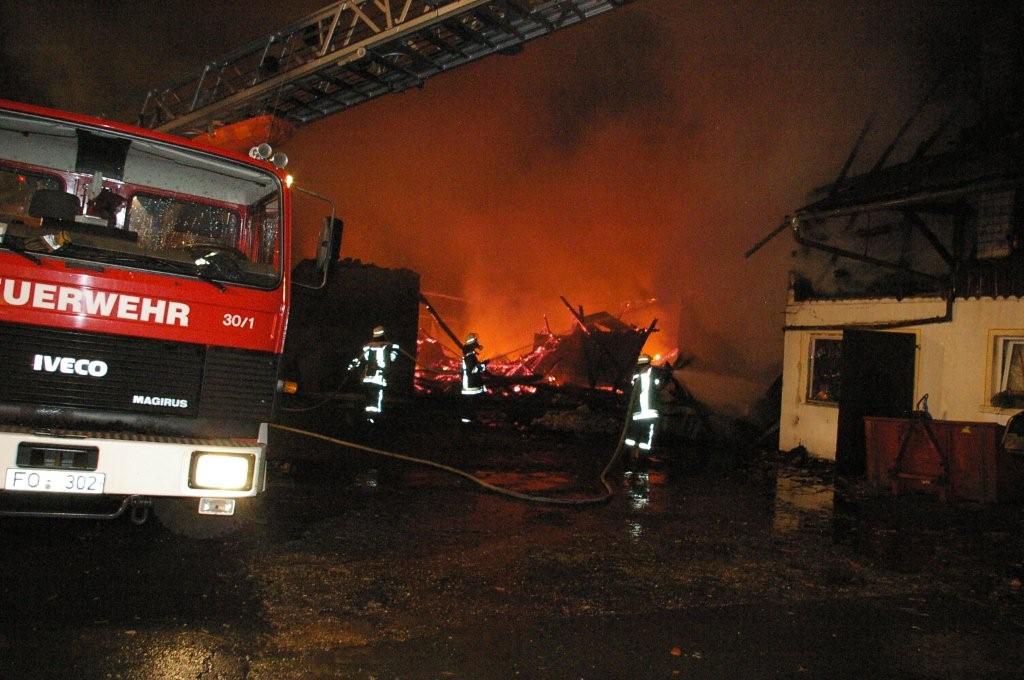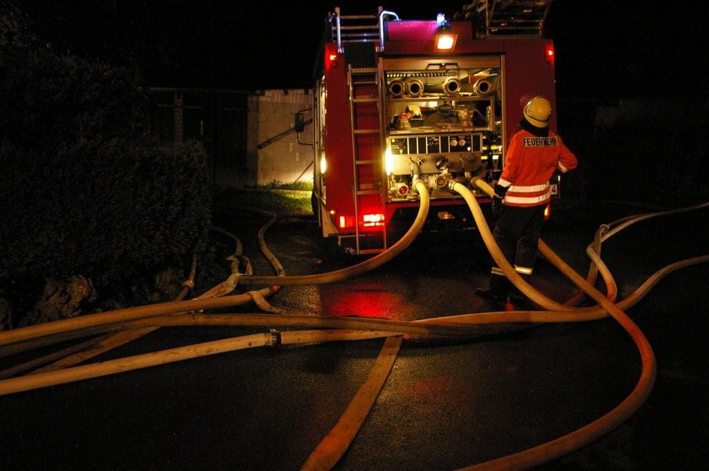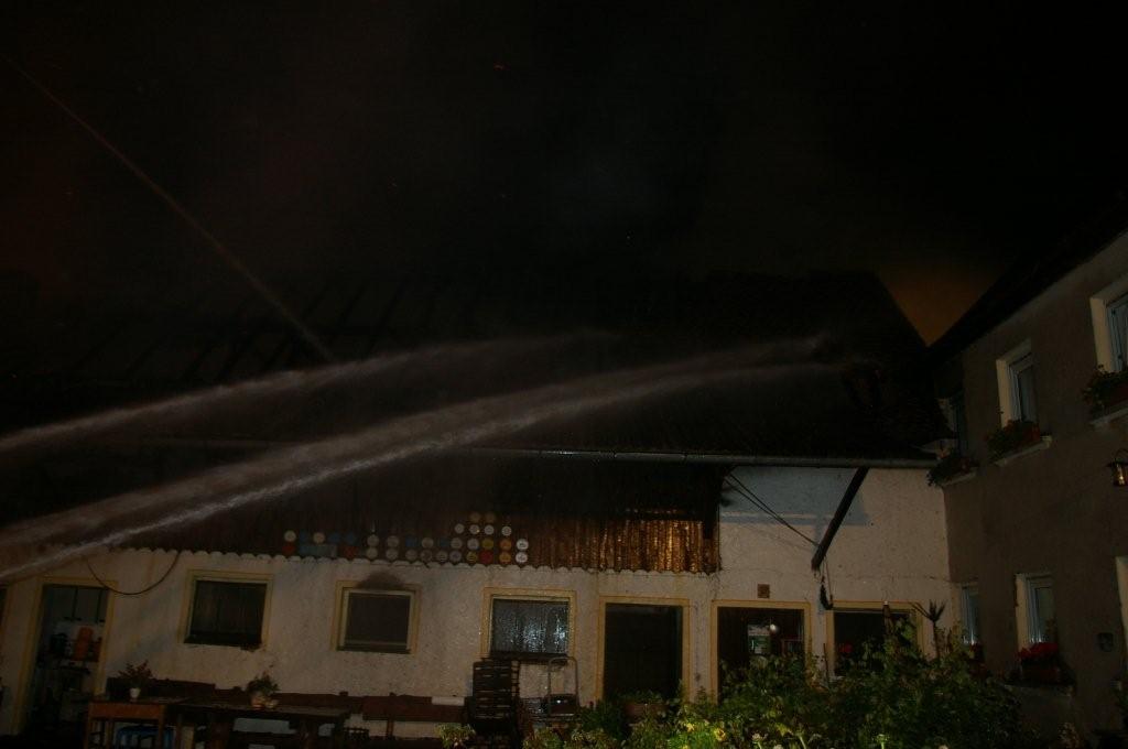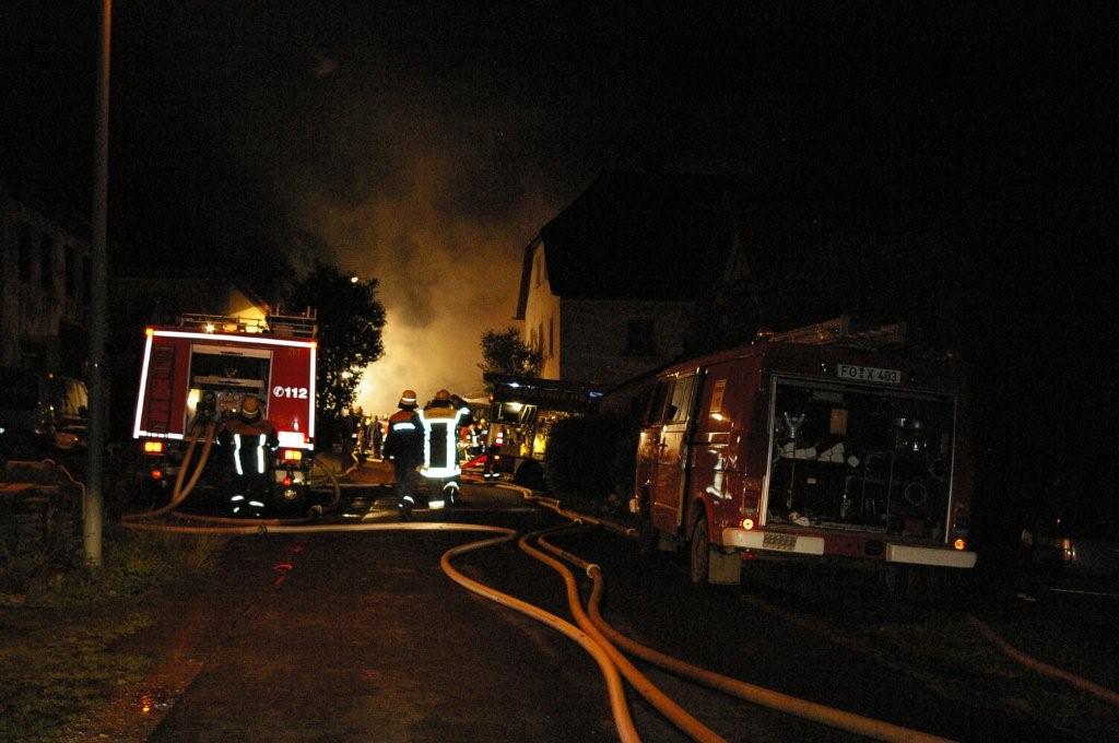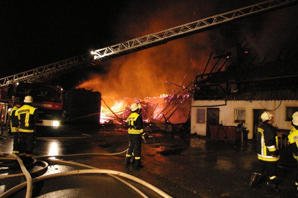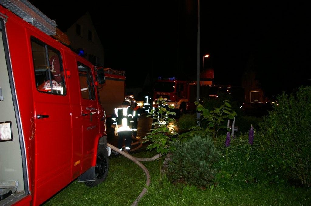 Dauer: 4 Std Einsatzdokumentation: Durch Sirene und Funkwecker wurde die FF Heiligenstadt alarmiert. In Störnhof (Gemeinde Wiesenttal, Lkr. Forchheim) brennt eine Scheune. Schon bei der Anfahrt war der Feuerschein weit sichtbar - das bzw. die Gebäude befanden sich bereits im Vollbrand. Die Löschwasserversorgung war bereits aufgebaut und verschiedene Wehren im Einsatz. Wasser wurde aus dem Löschwasserbehälter in Störnhof und über eine 1,2 km lange Schlauchleitung aus dem Behälter in Oberfellendorf bezogen. Mit den Tanklöschfahrzeugen wurde ein Pendelverkehr zur Wiederbefüllen der Behälter durchgeführt. Zusätzlich beteiligten sich einige Bauern mit ihren Güllefässern am Wassertransport. Bei dem schweren Gewitter schlug ein Blitz kurz nach 1 Uhr in eine 250 m² große Maschinenhalle ein und setzte sie in Brand. Beim Eintreffen der ersten Feuerwehren hatte das Feuer bereits auf die 150 m² große Stallung übergegriffen. Ca 30 Kühe und Kälber wurden aus dem brennenden Gebäude geholt. Durch Hitze und Feuer wurden zwei Wohngebäude ebenfalls in Mitleidenschaft gezogen. Vier Personen wurden verletzt (drei mit Rauchvergiftung und Schock, ein Helfer zog sich leichte Verletzungen bei Einfangen der Kühe zu) und vom Rettungsdienst ins Krankenhaus gebracht. Es entstand ein Sachschaden von rund 150.000 €. Es waren über 200 Feuerwehrleute im Einsatz! Weitere Infos/Bilder: Bericht TV-Oberfranken Bilder FF Ebermannstadt Bilder FF Kirchehrenbach Danke den Kameraden von Ebermannstadt und Kirchehrenbach für die Bilder!