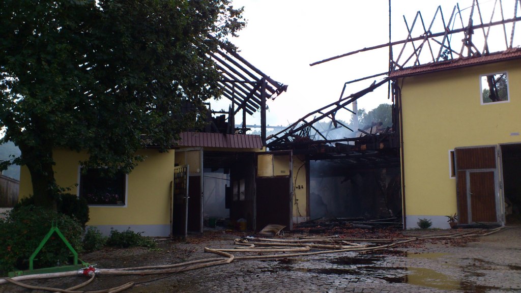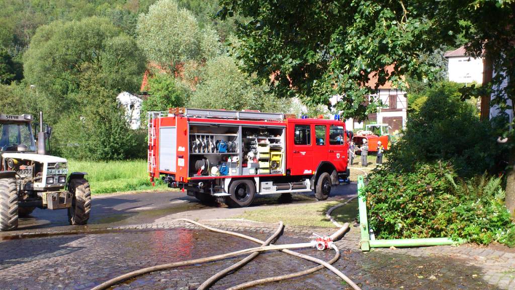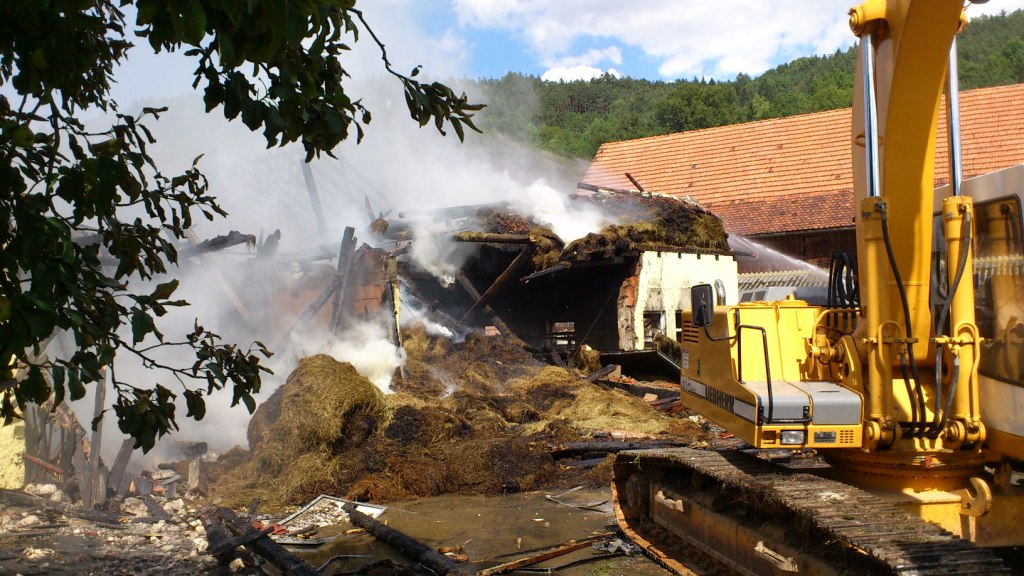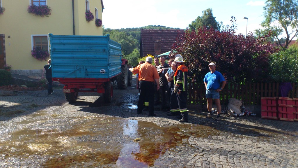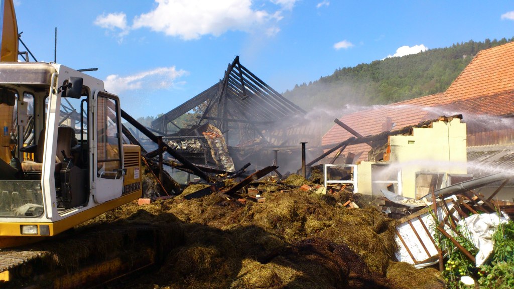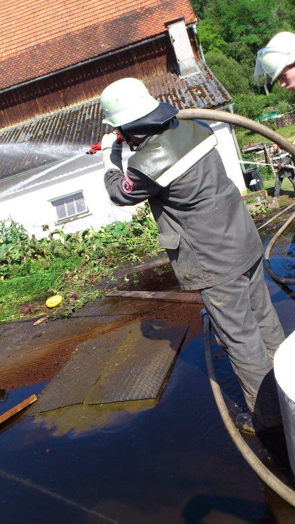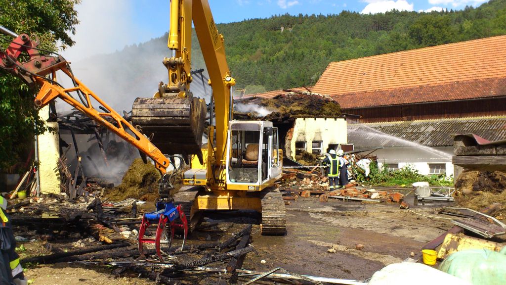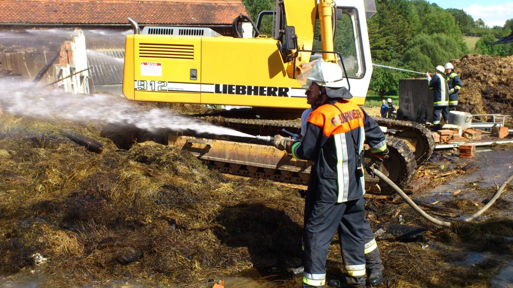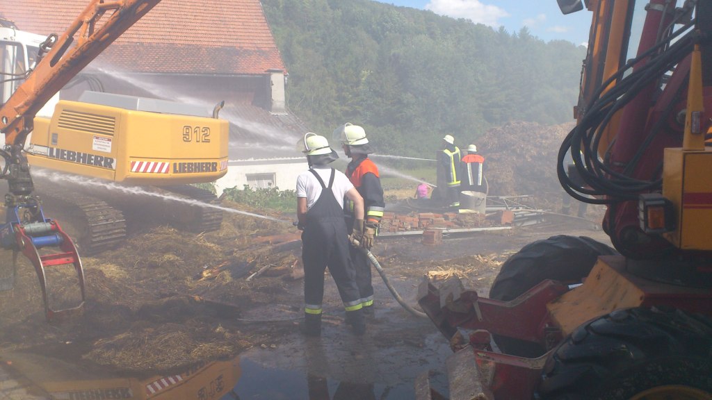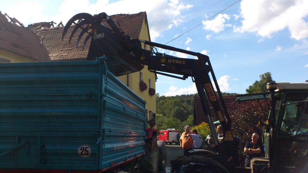 Mit schwerem Gerät wurde die Brandlast aus dem zerstörten Gebäude geholt und abtransportiert. Immer wieder wurden Glutnester entdeckt, die abgelöscht wurden. Dadurch kam es natürlich auch zu Rauchentwicklung. Wasserentnahme an der Leinleiter Die Jauchgrube lief durch das Löschwasser voll und quoll über! Einsatzbesprechung mit dem KBI.
