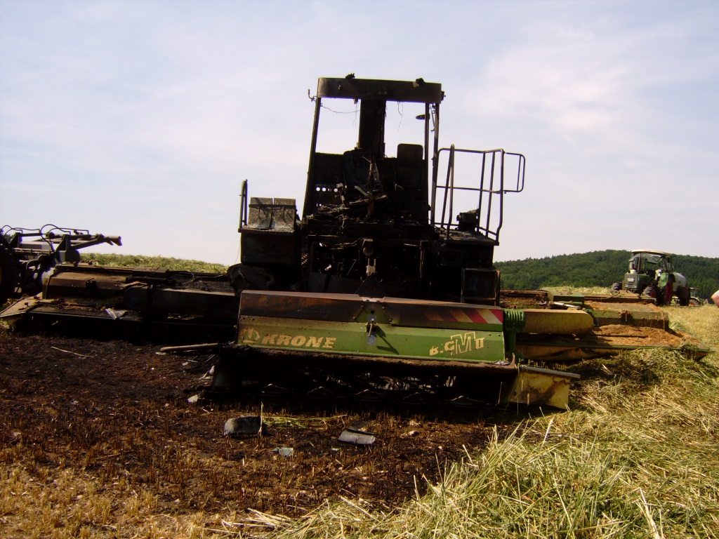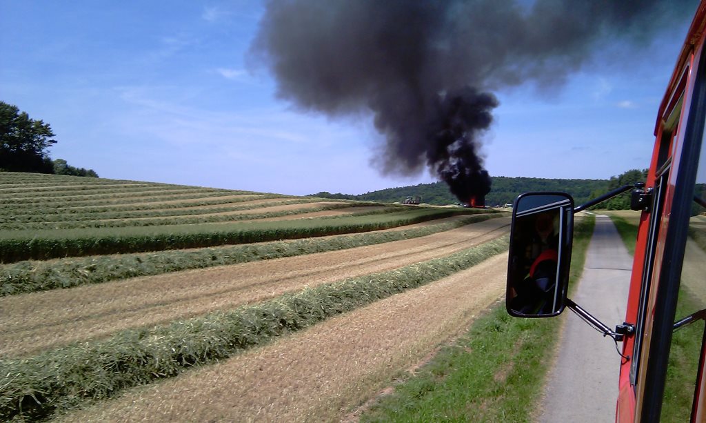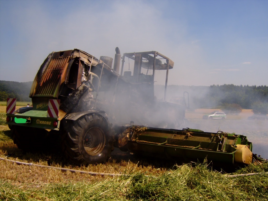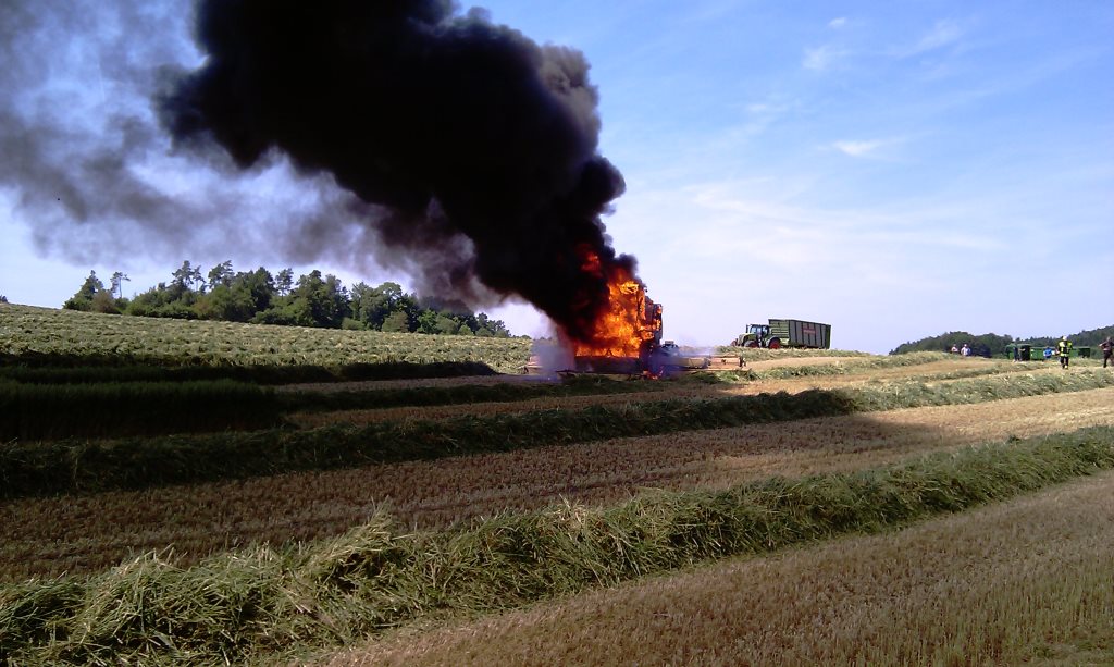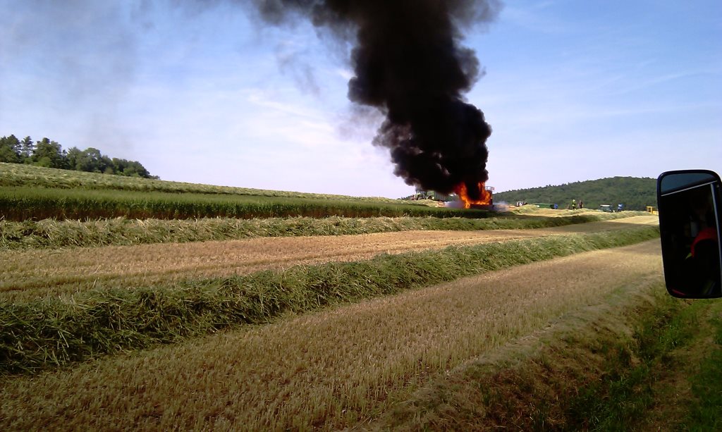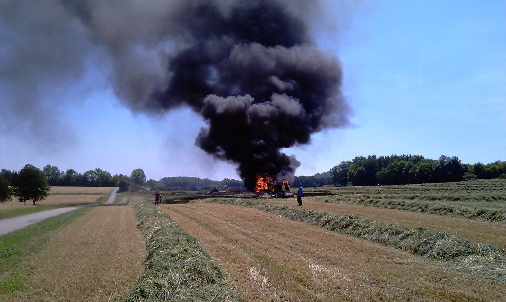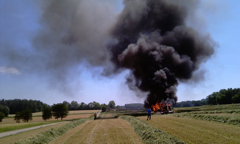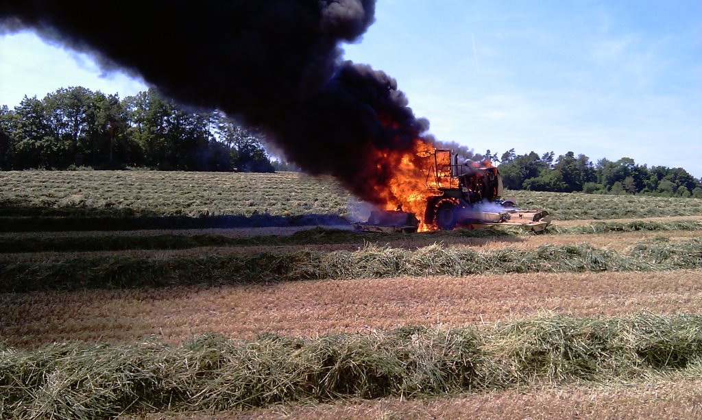 geriet ein selbstfahrendes Mähwerk in Brand. Der Landwirt, der eine