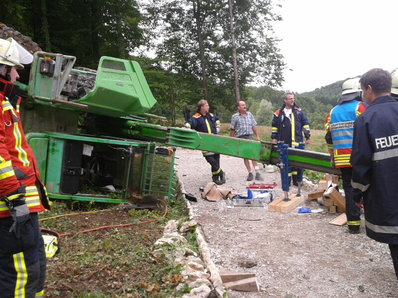 aufgebaut werden. Der eingesetzte Teleskoplader kippte allerdings um und klemmte