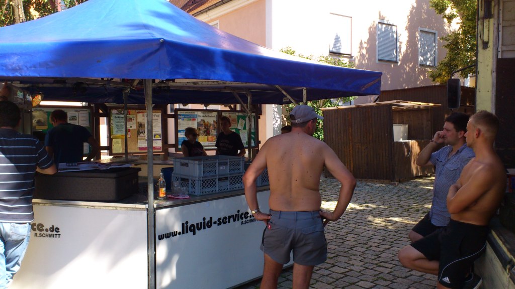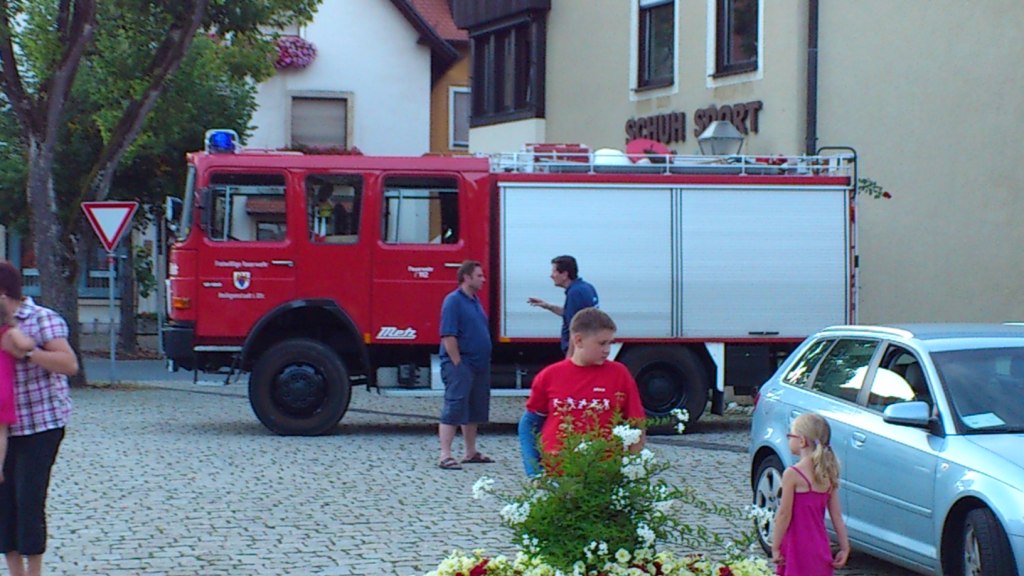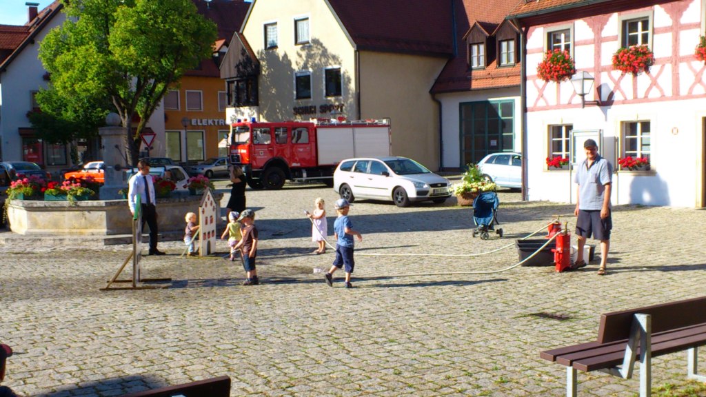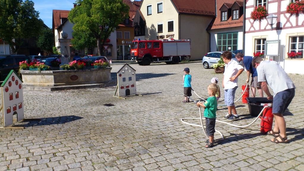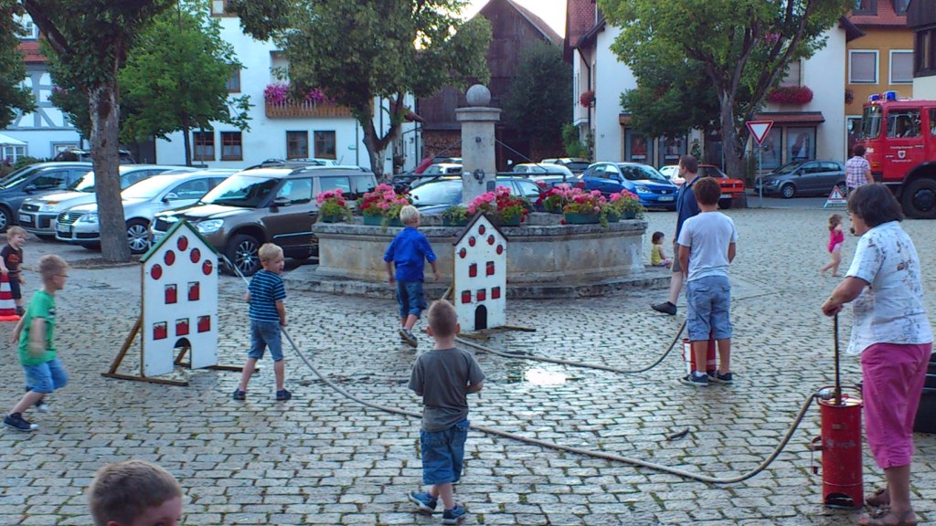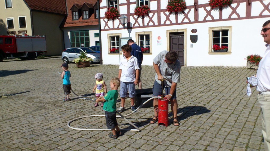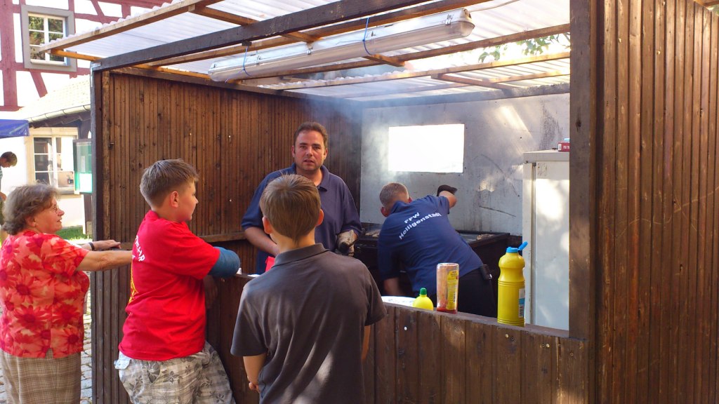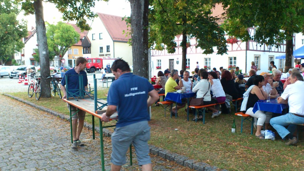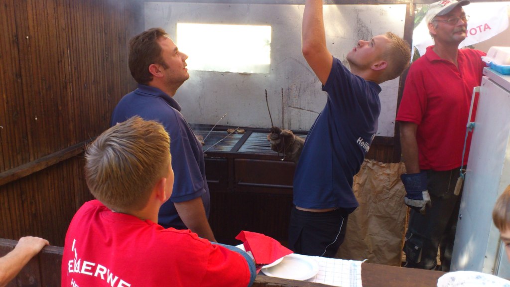 Am 18. August war es wieder soweit: es fand unser jährliches Grillfest unter den Linden am Marktplatz in Heiligenstadt statt. Gut gewappnet gingen wir den Nachmittag an. Leider sind einige Highlights ausgefallen: ein altes Magirus-TLF konnte wegen technische Probleme nicht kommen. Ebenfalls waren die Kameraden aus Eckersdorf mit ihrem neuen HLF20/16 nicht vor Ort. Nichts desto weniger war es wieder eine gelungene Veranstaltung. Auf Grund der Hitze kamen die meisten unsere Gäste erst ab ca. 18.00 Uhr - blieben dafür aber etwas länger. Hier einige Impressionen: Die letzten Aufbauarbeiten sind fast abgeschlossen. Für die Kinderbelustigung ist alles vorbereitet - der Platz auch abgesperrt. Die Tische stehen - der Platz unter den Linden ist hervorragend geeignet für solch ein Grillfest. Auch unser TLF ist bereit, um gezeigt zu werden. Warten auf den "Grillfesteinsatz" Die ersten Nachwuchsfeuerwehrleute im Einsatz... ... mit tatkräftiger Unterstützung der Väter. Fast alles gelöscht (s. Schattenbild) Das erste Bier wird gezapft. In der Grillbude wird der Rauchabzug geöffnet - cabriomäßig! Trotzdem eine schweißtreibende Arbeit. Erstmalig gab es Champignons (gefüllt) vom Grill Langsam füllten sich die Plätze. An den Kübelspritzen war immer was los - Wasserversorgung aus dem Brunnen klappte hervorragend!