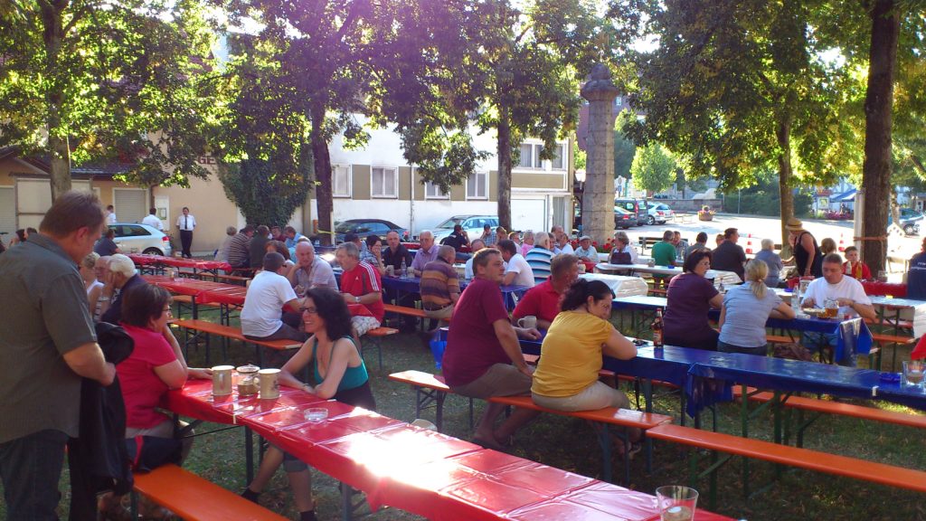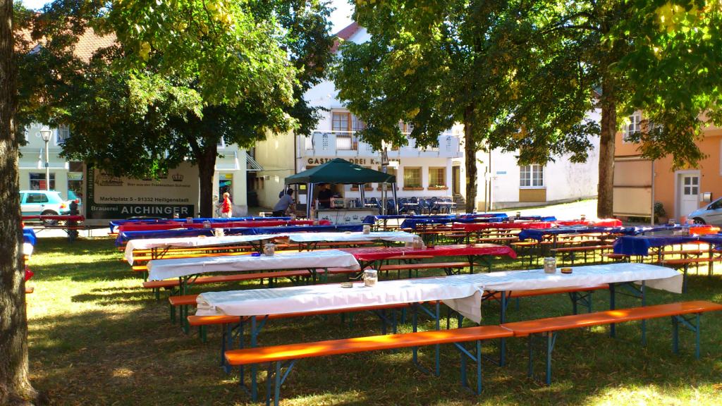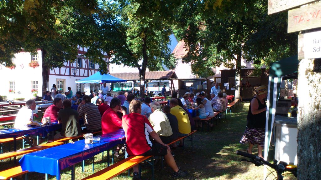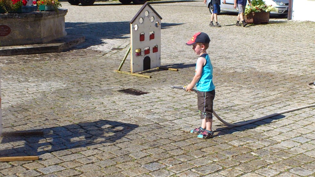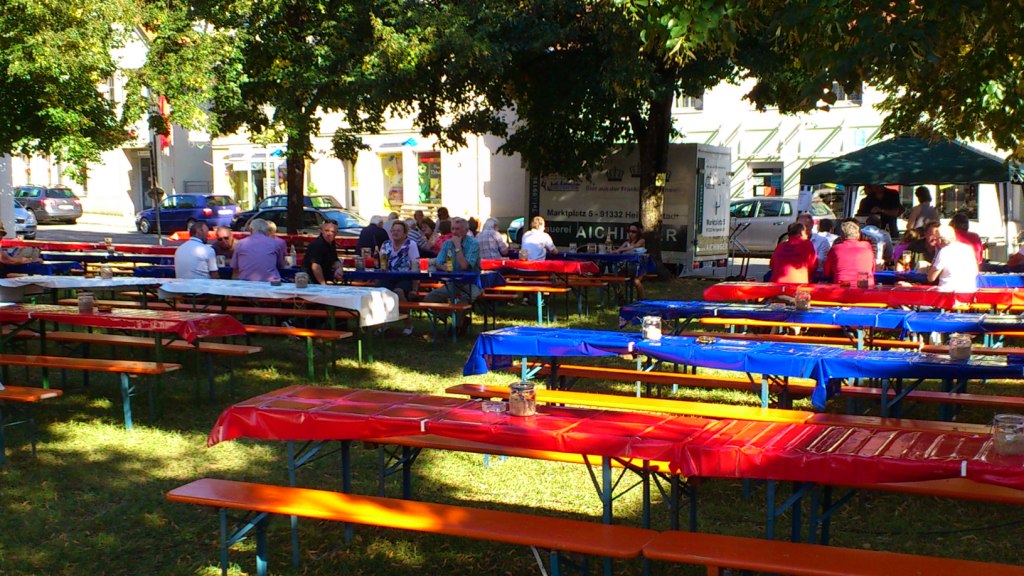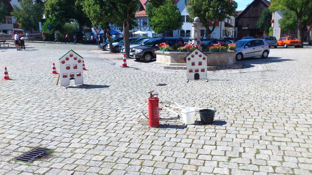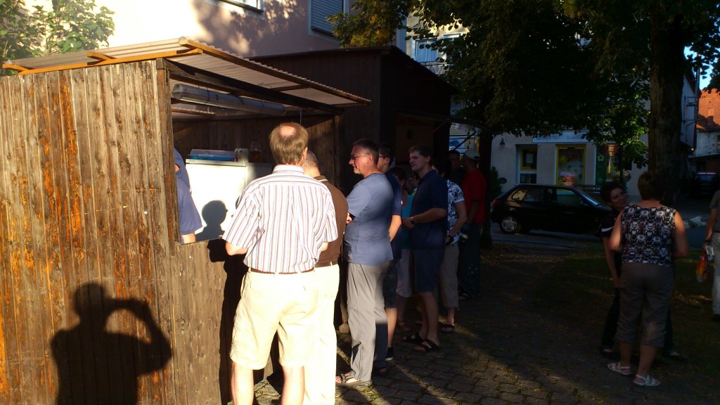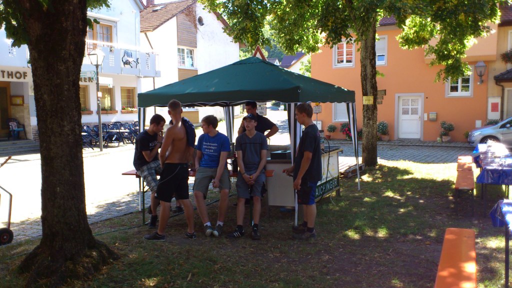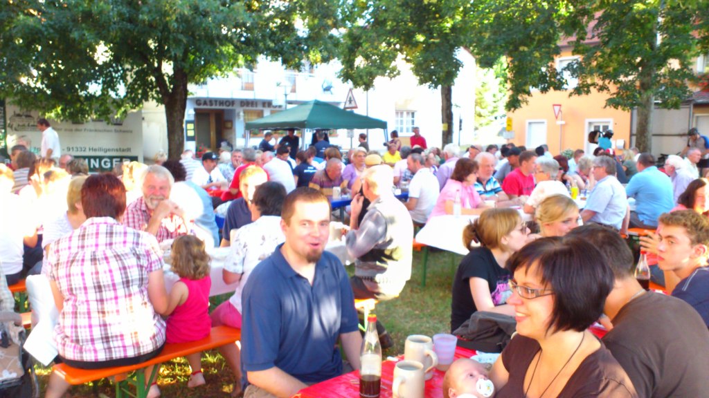 Am 18. August war es wieder soweit: es fand unser jährliches Grillfest unter den Linden am Marktplatz in Heiligenstadt statt. Gut gewappnet gingen wir den Nachmittag an. Leider sind einige Highlights ausgefallen: ein altes Magirus-TLF konnte wegen technische Probleme nicht kommen. Ebenfalls waren die Kameraden aus Eckersdorf mit ihrem neuen HLF20/16 nicht vor Ort. Nichts desto weniger war es wieder eine gelungene Veranstaltung. Auf Grund der Hitze kamen die meisten unsere Gäste erst ab ca. 18.00 Uhr - blieben dafür aber etwas länger. Hier einige Impressionen: Die letzten Aufbauarbeiten sind fast abgeschlossen. Für die Kinderbelustigung ist alles vorbereitet - der Platz auch abgesperrt. Die Tische stehen - der Platz unter den Linden ist hervorragend geeignet für solch ein Grillfest. Auch unser TLF ist bereit, um gezeigt zu werden. Warten auf den "Grillfesteinsatz" Die ersten Nachwuchsfeuerwehrleute im Einsatz... ... mit tatkräftiger Unterstützung der Väter. Fast alles gelöscht (s. Schattenbild) Das erste Bier wird gezapft. In der Grillbude wird der Rauchabzug geöffnet - cabriomäßig! Trotzdem eine schweißtreibende Arbeit. Erstmalig gab es Champignons (gefüllt) vom Grill Langsam füllten sich die Plätze. An den Kübelspritzen war immer was los - Wasserversorgung aus dem Brunnen klappte hervorragend!