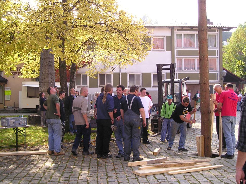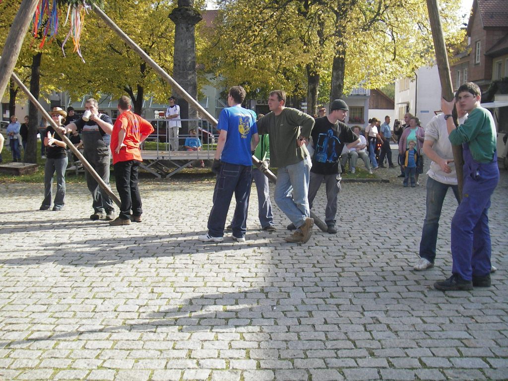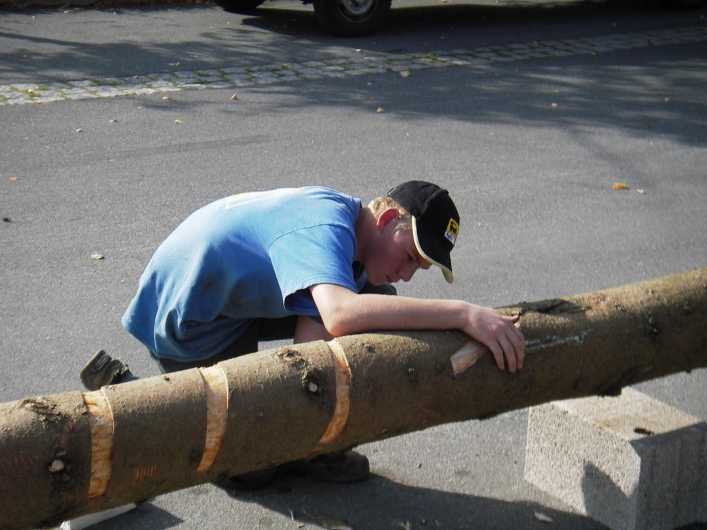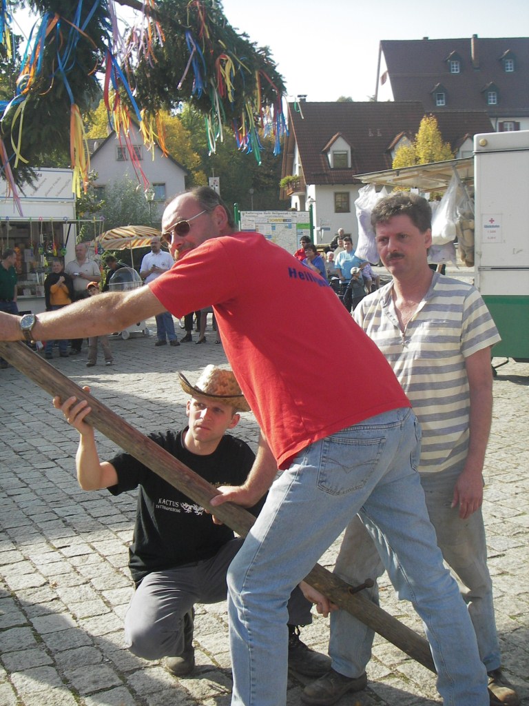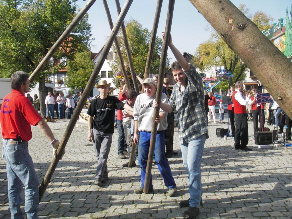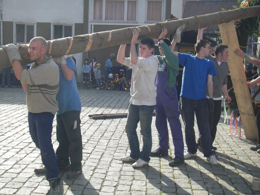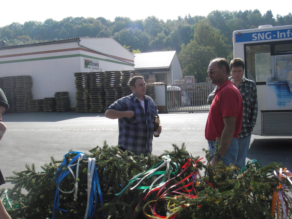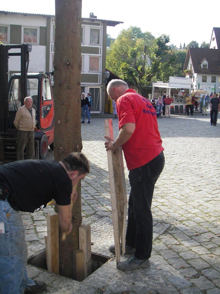 Das Schmücken: Erstmal stärken, ... ...während die Damen nun "angreifen". Verzierung durch einen Mann vom Fach. Nun wird der Transport vorbereitet. Erst noch mal stärken und kurz relaxen, bevor abmarschiert wird. Der Verpflegungswagen für unterwegs (ist ja ein langer Weg von der Raiffeisenstrasse zum Marktplatz). Alles wird nochmals überprüft... ...Unter Aufsicht, versteht sich! Unterwegs war soviel zu tun 8jede helfende Hand wurde benötigt) - deshalb gibt es vom Marschweg keine Bilder. Der Baum wird eingesetzt, ... ... während das Transportmittel aus der Schusslinie gebracht wird. Erfahrene, langjährige Helfer waren auch vor Ort. Der "Aufstellmeister" gibt letzte Anweisungen... ... während sich andere um das leibliche Wohl der hart arbeitenden Kameraden kümmern. Mit von der Partie war wie immer die Hohenpölzer Blasmusik. Bald ist's geschafft! Die letzten Keile werden angebracht. Und dann war's geschafft! Die Stärkung danach. Leichte Nachbesserungen.