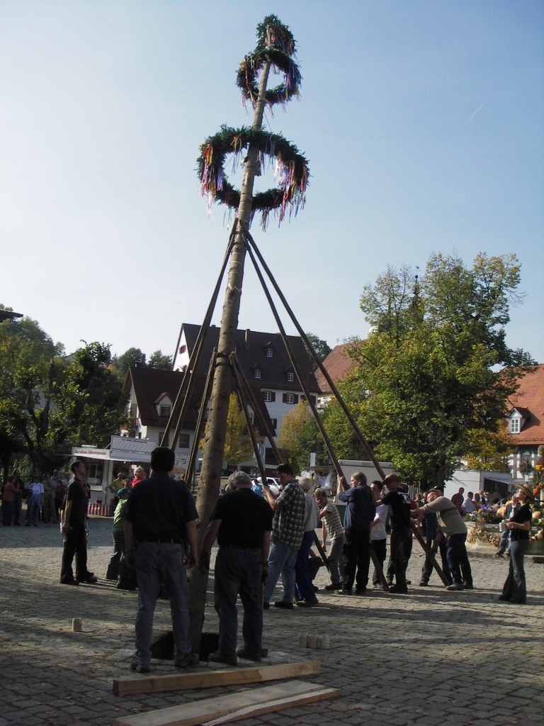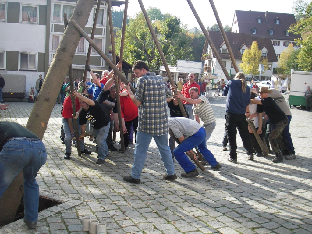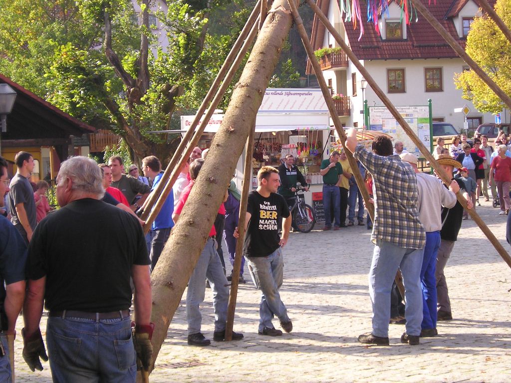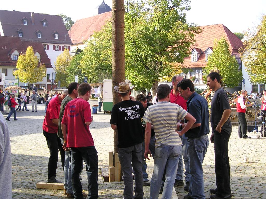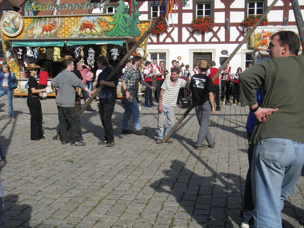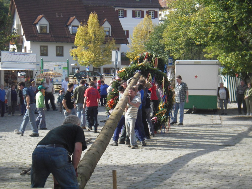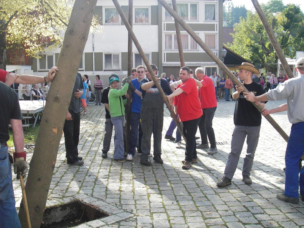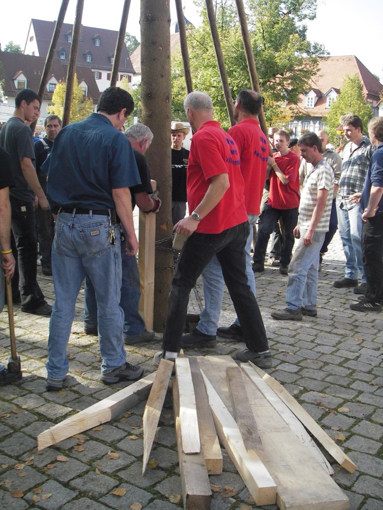 Das Schmücken: Erstmal stärken, ... ...während die Damen nun "angreifen". Verzierung durch einen Mann vom Fach. Nun wird der Transport vorbereitet. Erst noch mal stärken und kurz relaxen, bevor abmarschiert wird. Der Verpflegungswagen für unterwegs (ist ja ein langer Weg von der Raiffeisenstrasse zum Marktplatz). Alles wird nochmals überprüft... ...Unter Aufsicht, versteht sich! Unterwegs war soviel zu tun 8jede helfende Hand wurde benötigt) - deshalb gibt es vom Marschweg keine Bilder. Der Baum wird eingesetzt, ... ... während das Transportmittel aus der Schusslinie gebracht wird. Erfahrene, langjährige Helfer waren auch vor Ort. Der "Aufstellmeister" gibt letzte Anweisungen... ... während sich andere um das leibliche Wohl der hart arbeitenden Kameraden kümmern. Mit von der Partie war wie immer die Hohenpölzer Blasmusik. Bald ist's geschafft! Die letzten Keile werden angebracht. Und dann war's geschafft! Die Stärkung danach. Leichte Nachbesserungen.