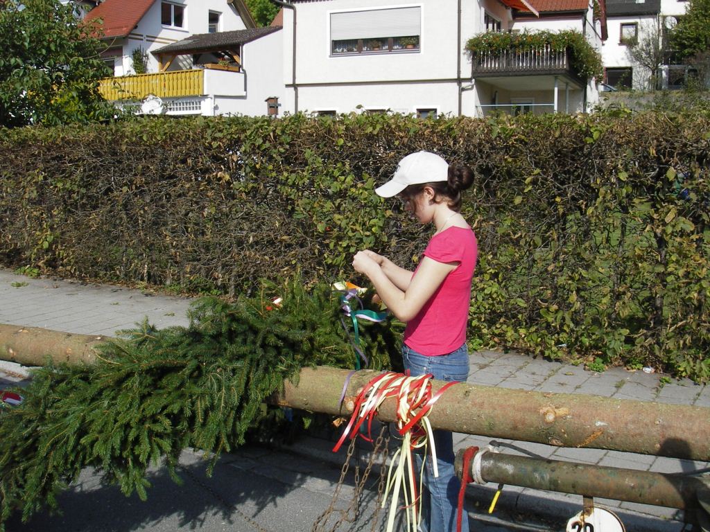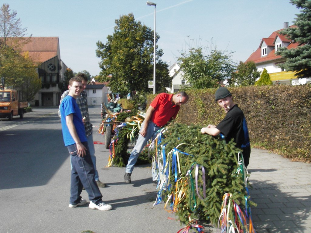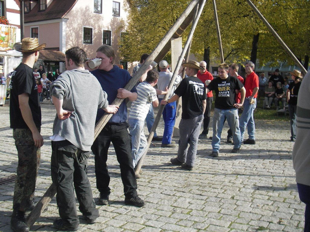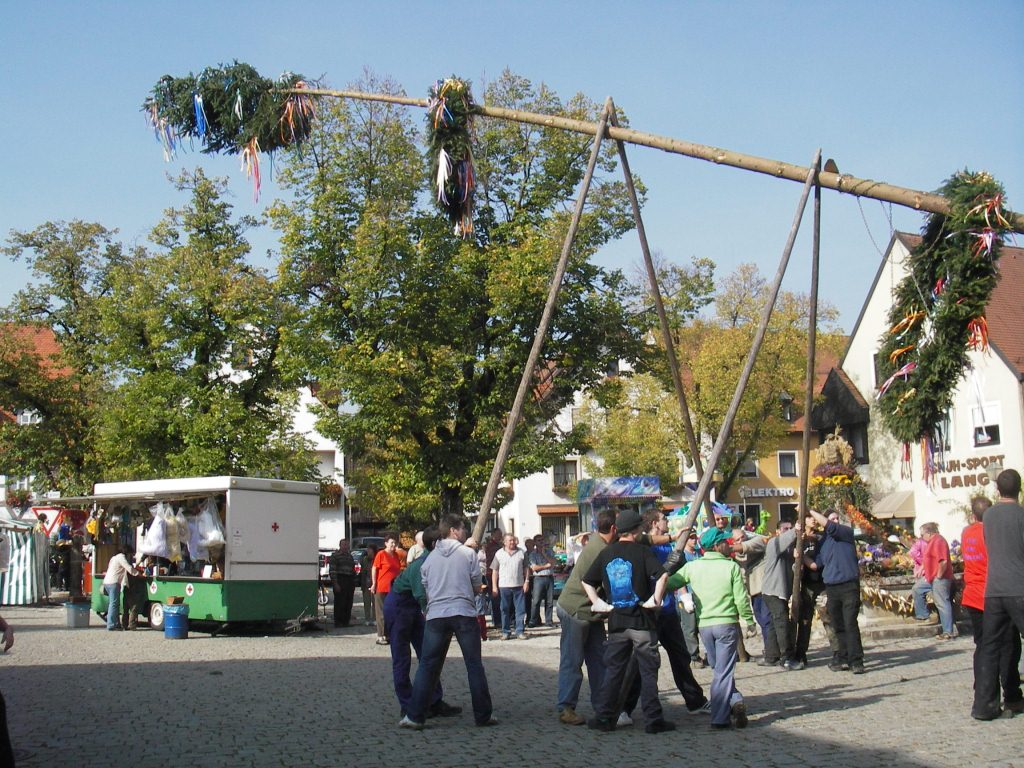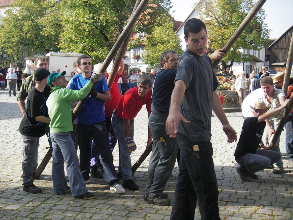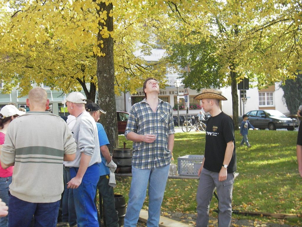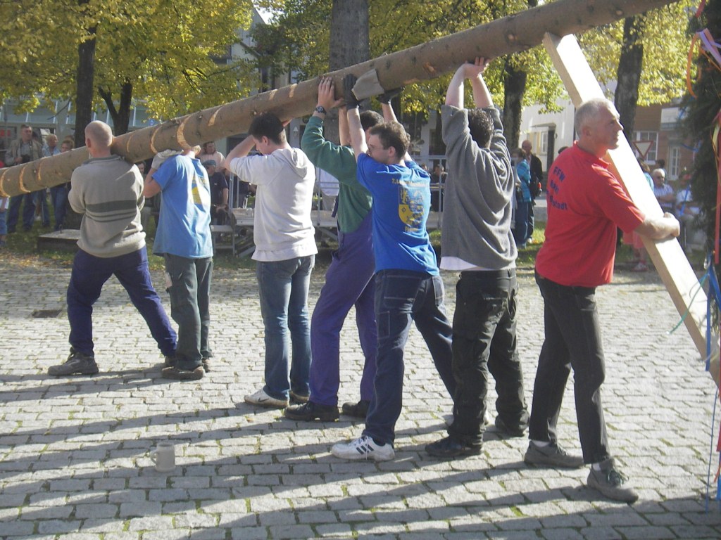 Das Schmücken: Erstmal stärken, ... ...während die Damen nun "angreifen". Verzierung durch einen Mann vom Fach. Nun wird der Transport vorbereitet. Erst noch mal stärken und kurz relaxen, bevor abmarschiert wird. Der Verpflegungswagen für unterwegs (ist ja ein langer Weg von der Raiffeisenstrasse zum Marktplatz). Alles wird nochmals überprüft... ...Unter Aufsicht, versteht sich! Unterwegs war soviel zu tun 8jede helfende Hand wurde benötigt) - deshalb gibt es vom Marschweg keine Bilder. Der Baum wird eingesetzt, ... ... während das Transportmittel aus der Schusslinie gebracht wird. Erfahrene, langjährige Helfer waren auch vor Ort. Der "Aufstellmeister" gibt letzte Anweisungen... ... während sich andere um das leibliche Wohl der hart arbeitenden Kameraden kümmern. Mit von der Partie war wie immer die Hohenpölzer Blasmusik. Bald ist's geschafft! Die letzten Keile werden angebracht. Und dann war's geschafft! Die Stärkung danach. Leichte Nachbesserungen.