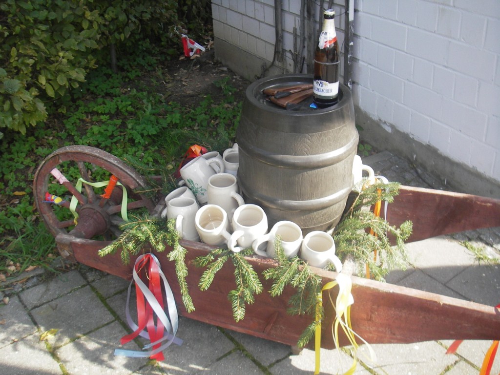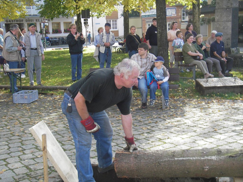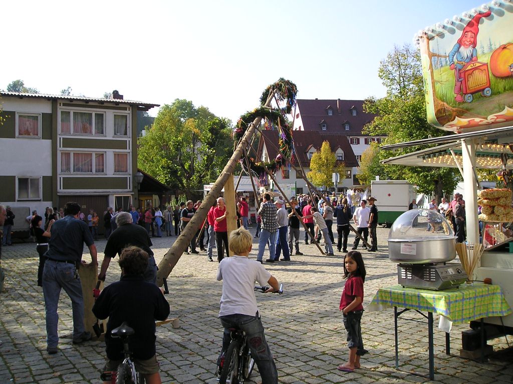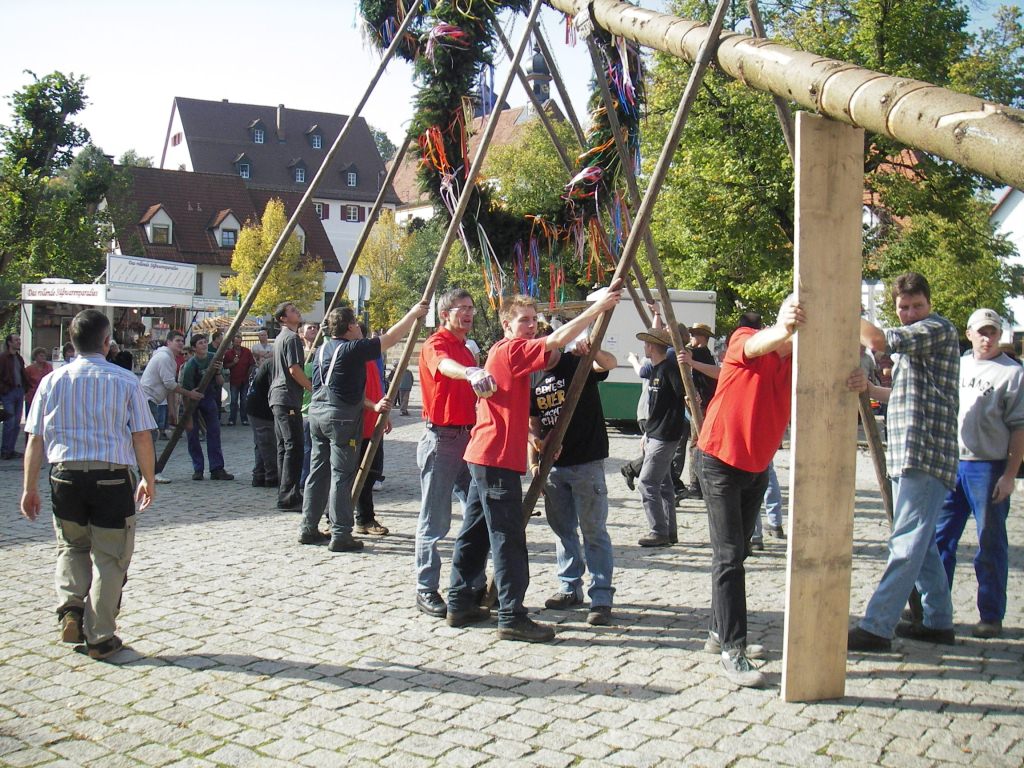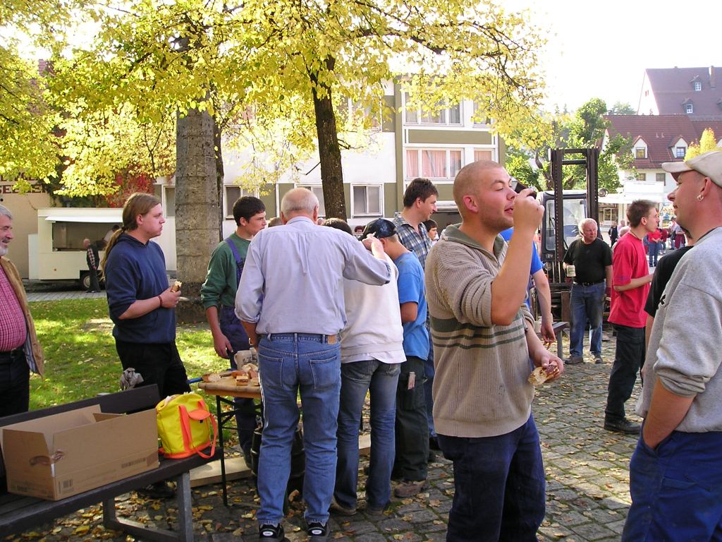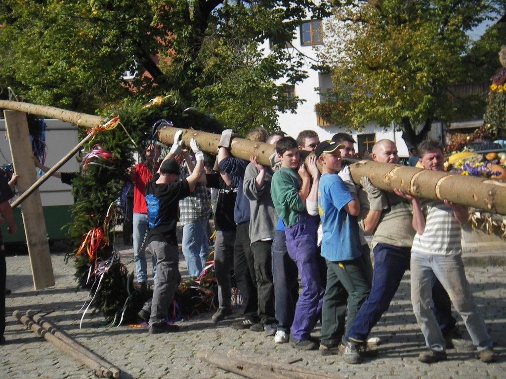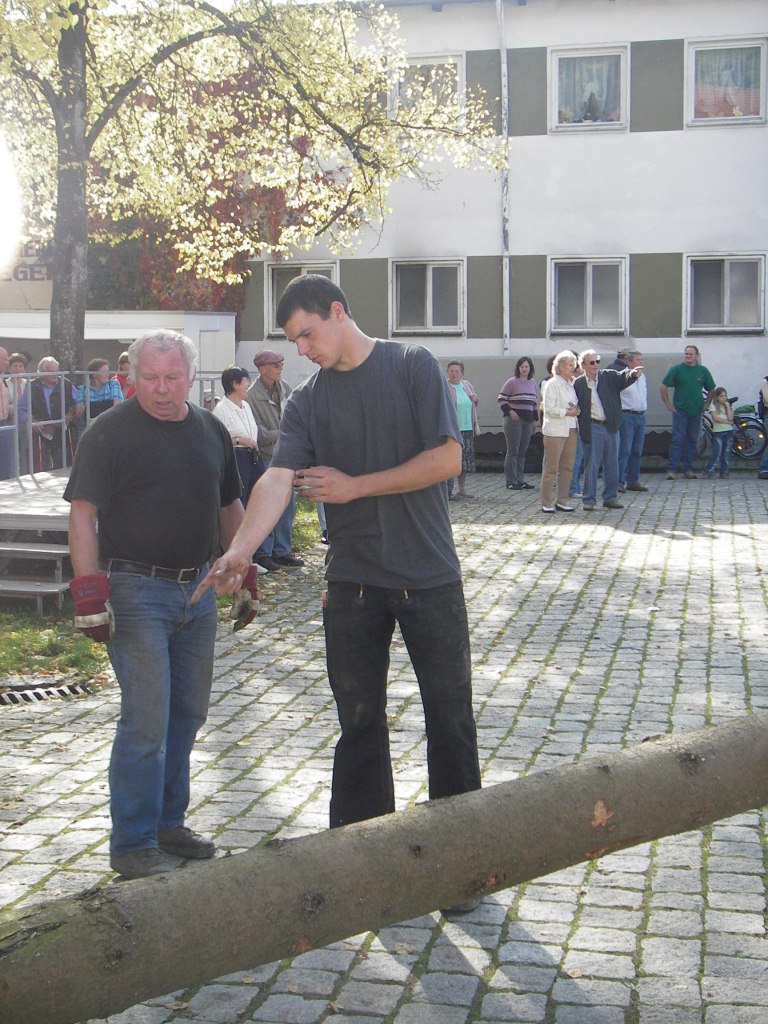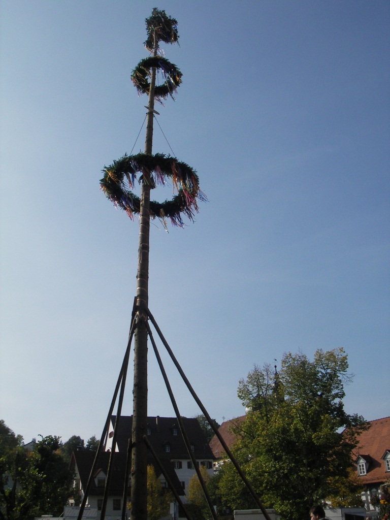 Das Schmücken: Erstmal stärken, ... ...während die Damen nun "angreifen". Verzierung durch einen Mann vom Fach. Nun wird der Transport vorbereitet. Erst noch mal stärken und kurz relaxen, bevor abmarschiert wird. Der Verpflegungswagen für unterwegs (ist ja ein langer Weg von der Raiffeisenstrasse zum Marktplatz). Alles wird nochmals überprüft... ...Unter Aufsicht, versteht sich! Unterwegs war soviel zu tun 8jede helfende Hand wurde benötigt) - deshalb gibt es vom Marschweg keine Bilder. Der Baum wird eingesetzt, ... ... während das Transportmittel aus der Schusslinie gebracht wird. Erfahrene, langjährige Helfer waren auch vor Ort. Der "Aufstellmeister" gibt letzte Anweisungen... ... während sich andere um das leibliche Wohl der hart arbeitenden Kameraden kümmern. Mit von der Partie war wie immer die Hohenpölzer Blasmusik. Bald ist's geschafft! Die letzten Keile werden angebracht. Und dann war's geschafft! Die Stärkung danach. Leichte Nachbesserungen.