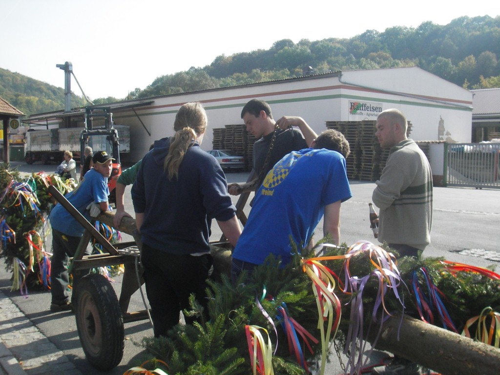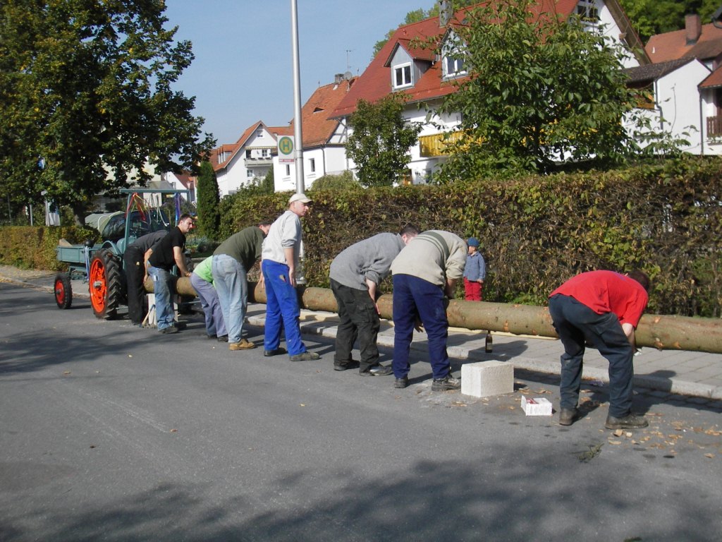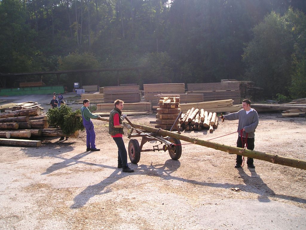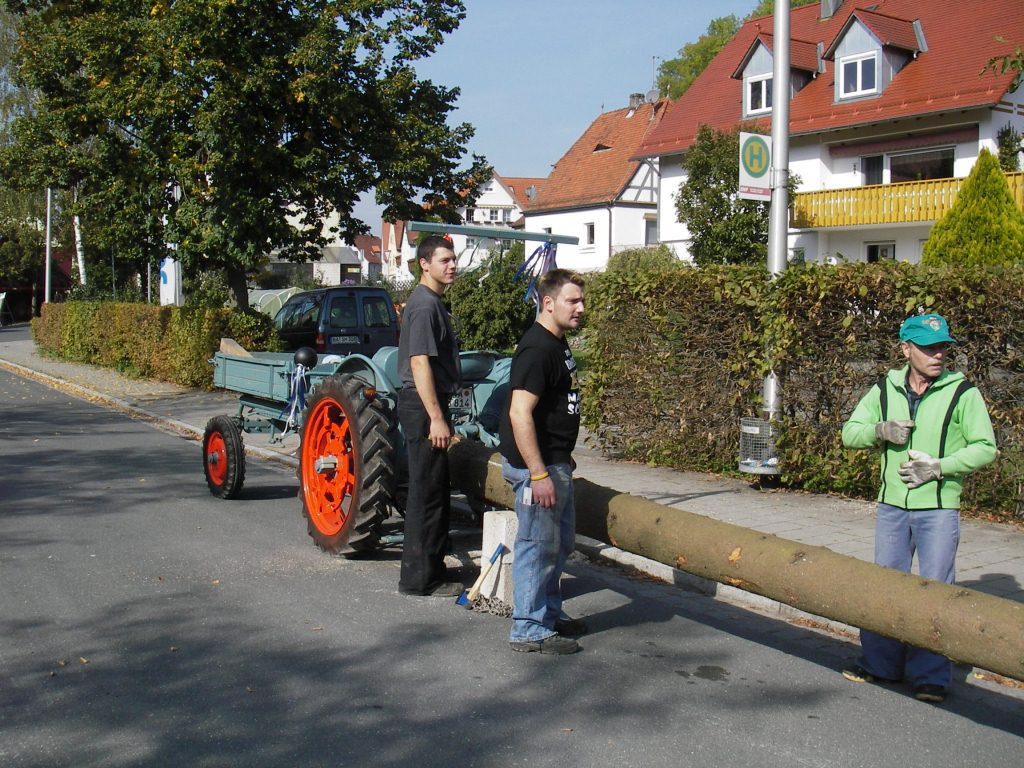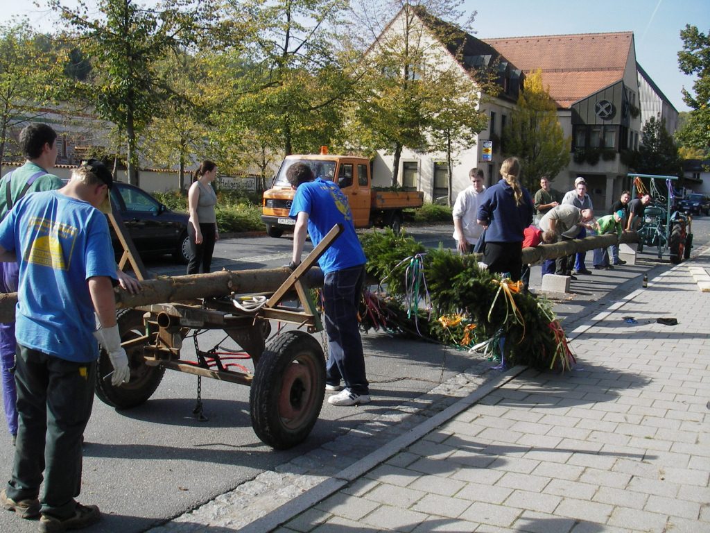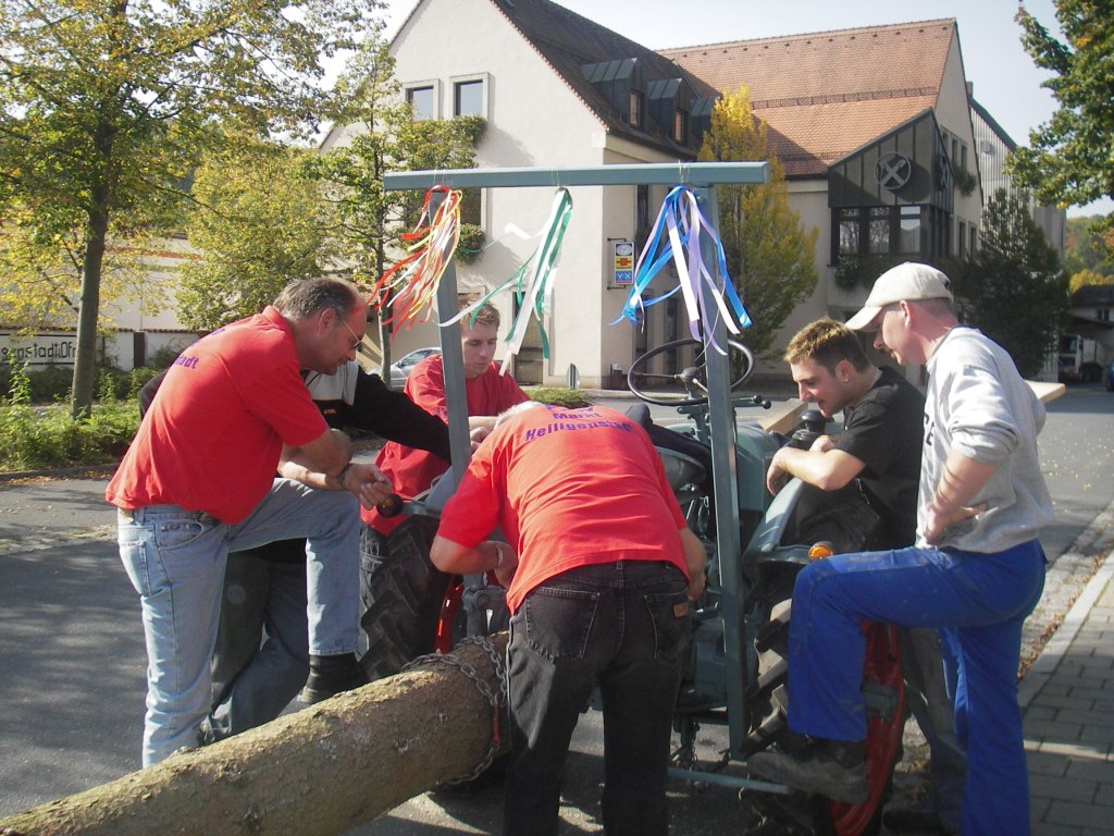 Auch 2005 wurde zur Herbstkerwa der Kerwabaum von der FF Heiligenstadt organisiert, geschmückt und aufgestellt. Selbstverständlich waren wie jedes Jahr auch (erfahrene) Helfer gern gesehen. Hier einige Bilder: Abholung des Baumes Holzrücken im schwierigen Gelände - auch das gehört zur Feuerwehrarbeit ;-) Andere hatten es da einfacher Der Baum wird verladen... und "gesichert" zum Schmücken gebracht.