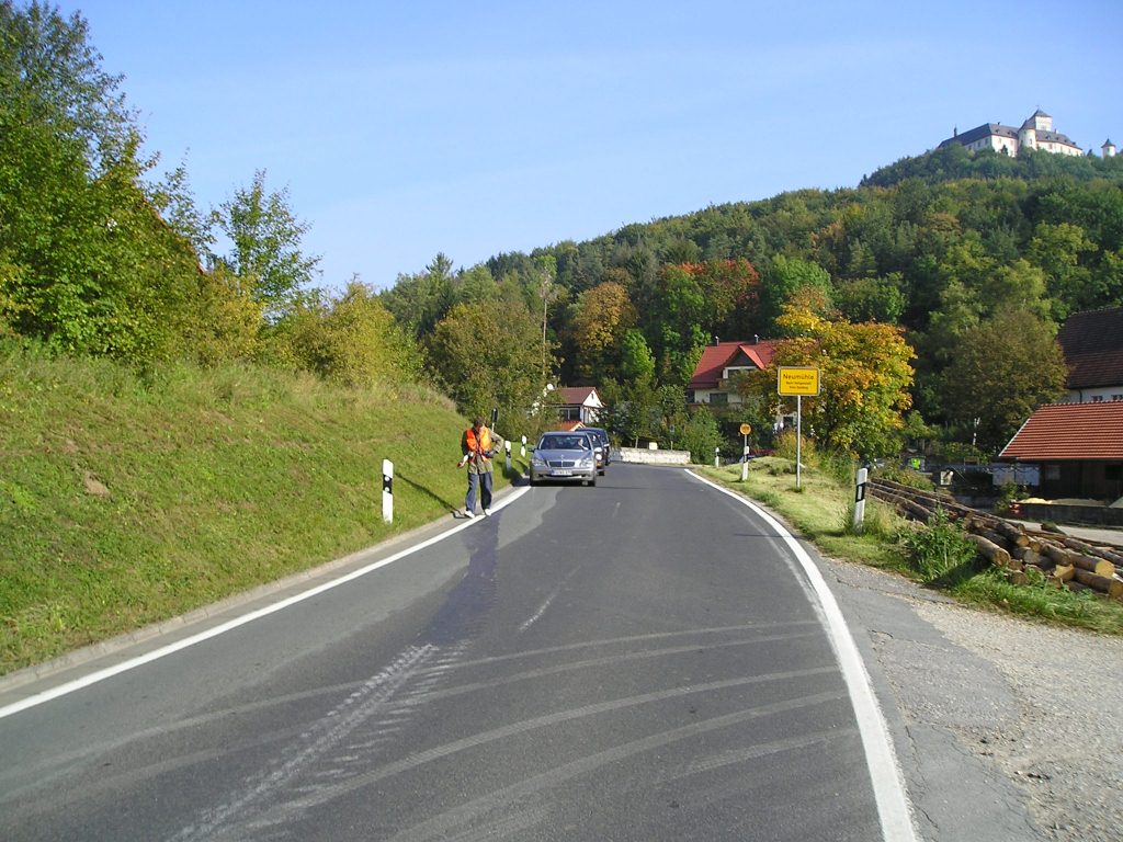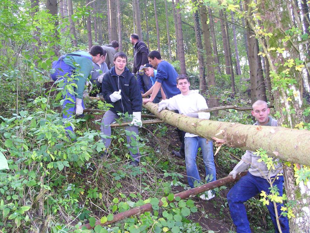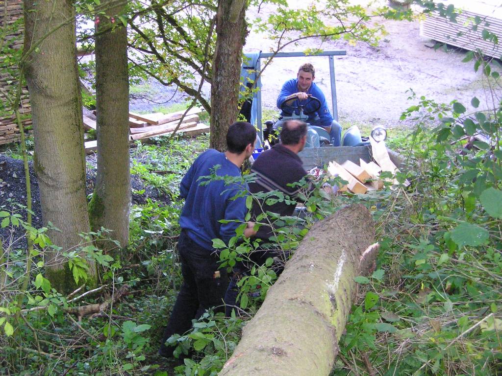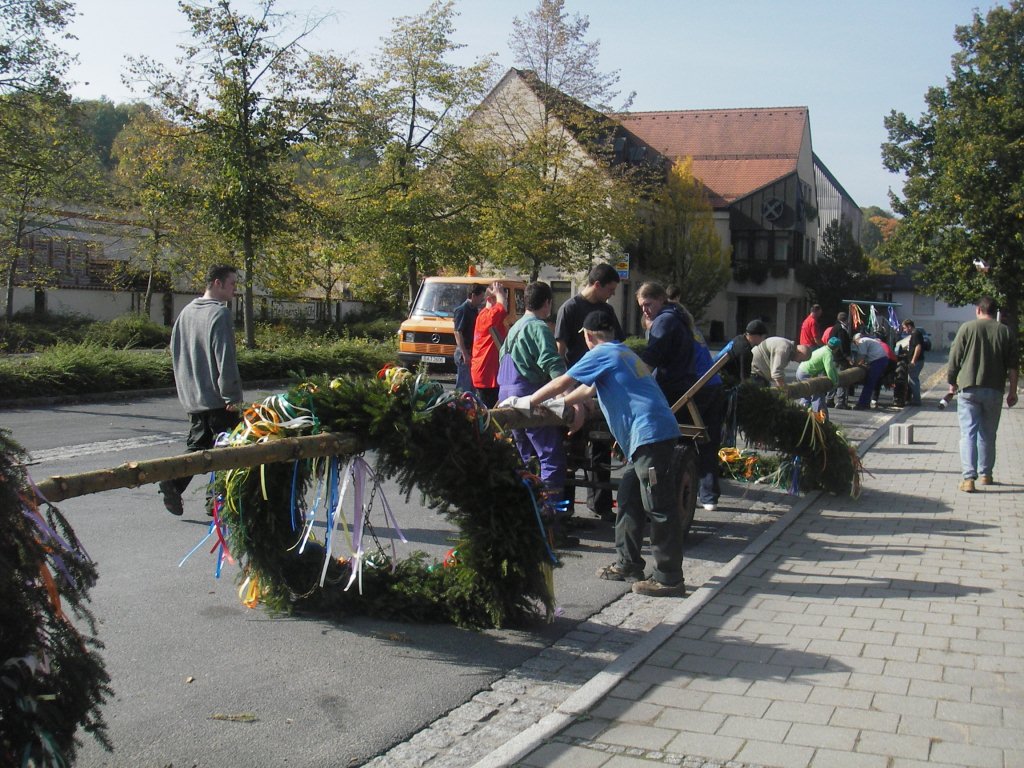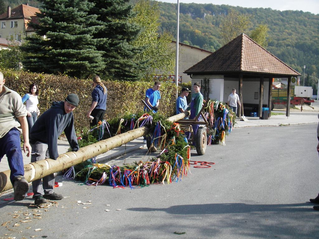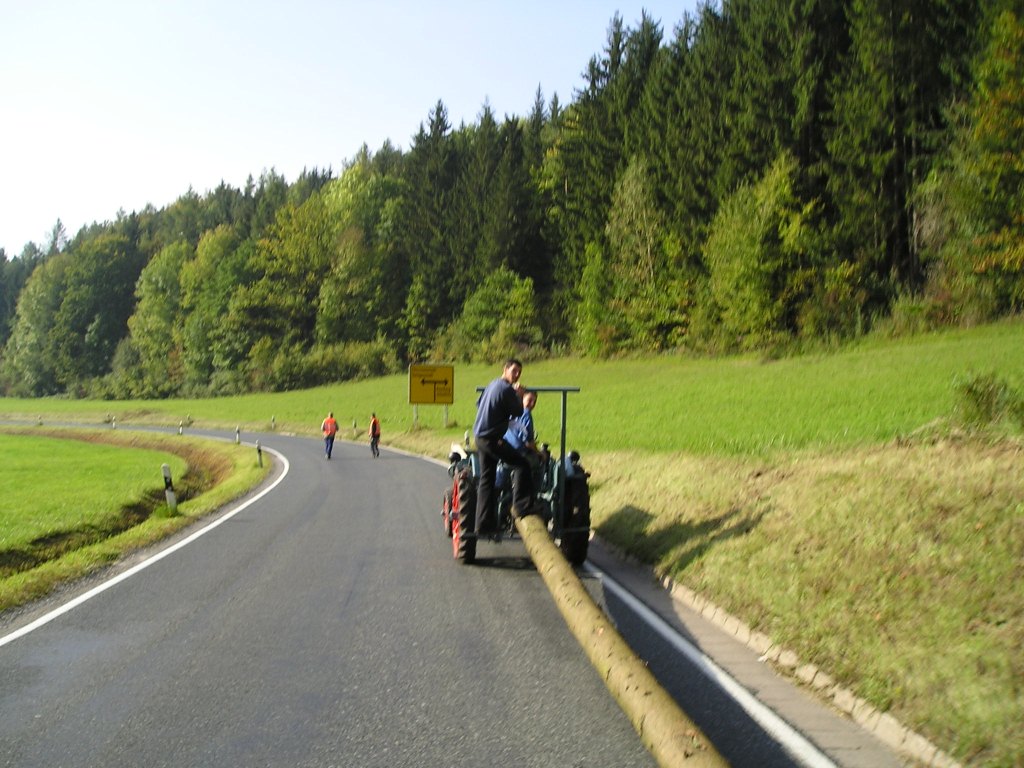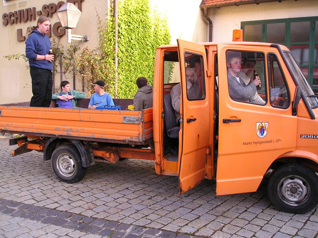 Auch 2005 wurde zur Herbstkerwa der Kerwabaum von der FF Heiligenstadt organisiert, geschmückt und aufgestellt. Selbstverständlich waren wie jedes Jahr auch (erfahrene) Helfer gern gesehen. Hier einige Bilder: Abholung des Baumes Holzrücken im schwierigen Gelände - auch das gehört zur Feuerwehrarbeit ;-) Andere hatten es da einfacher Der Baum wird verladen... und "gesichert" zum Schmücken gebracht.