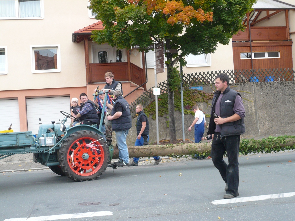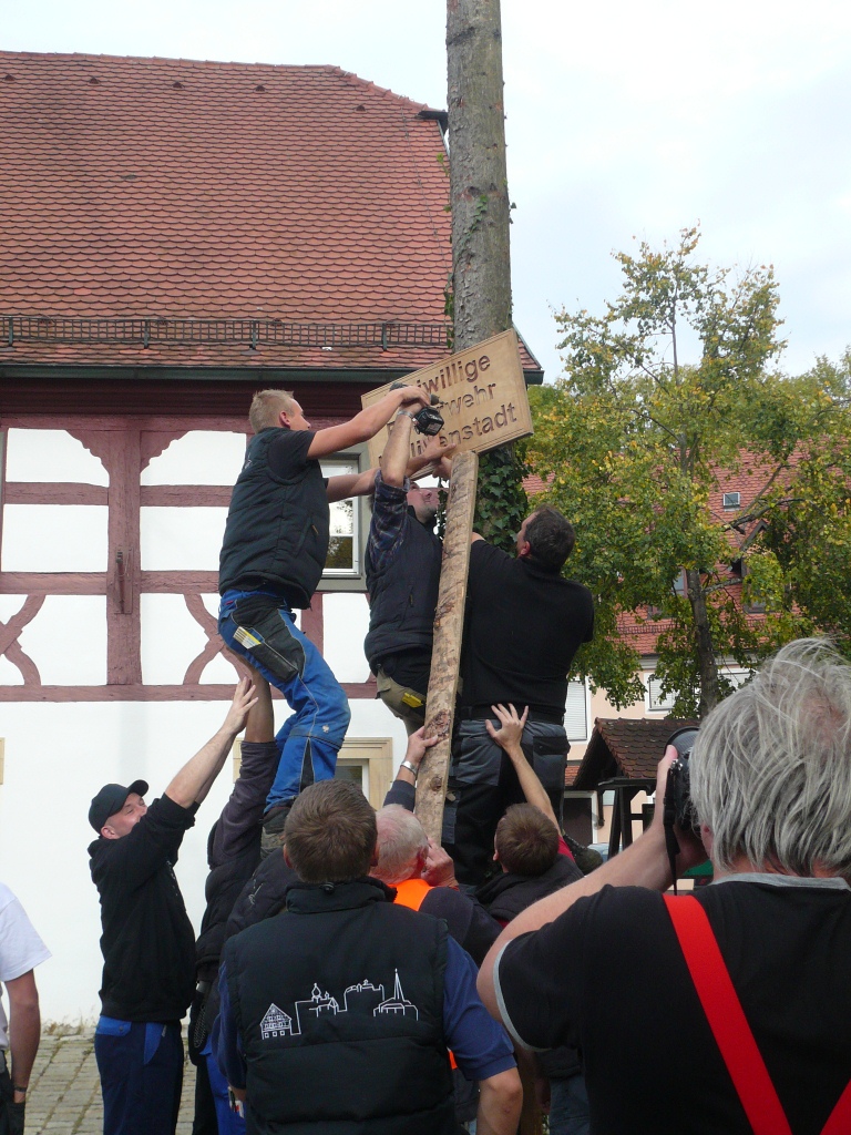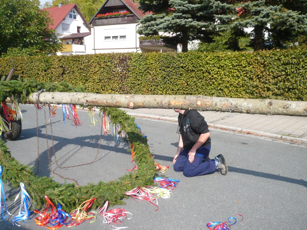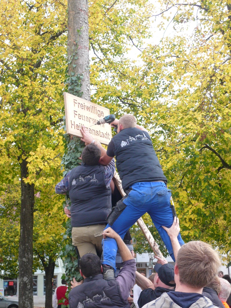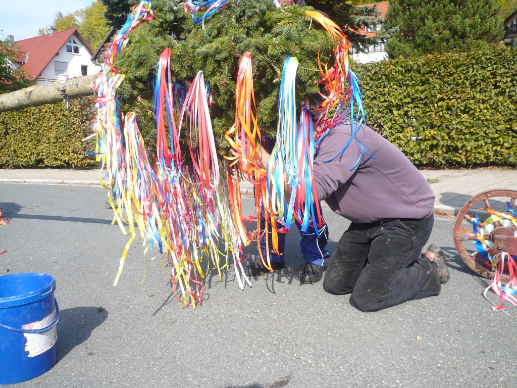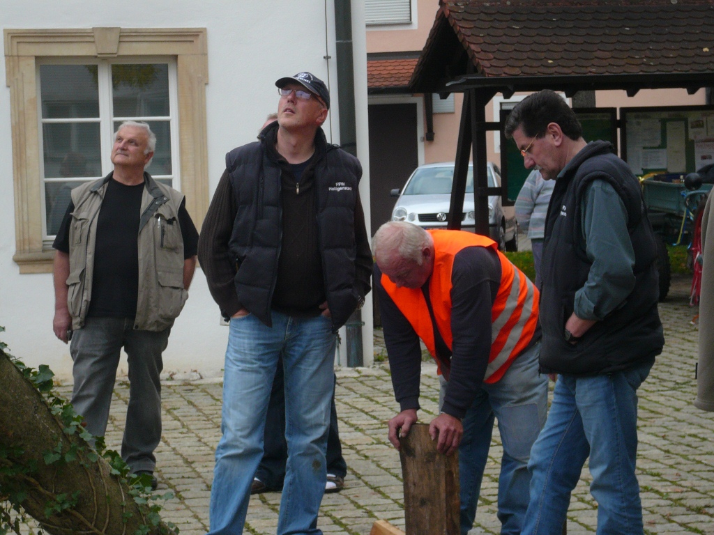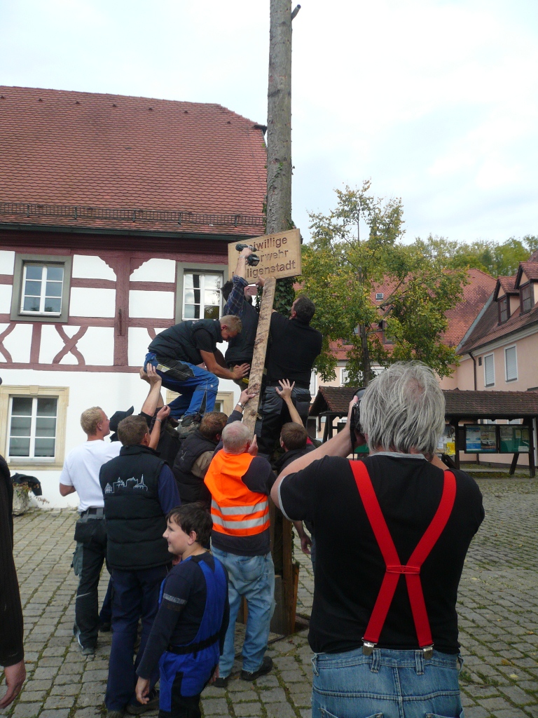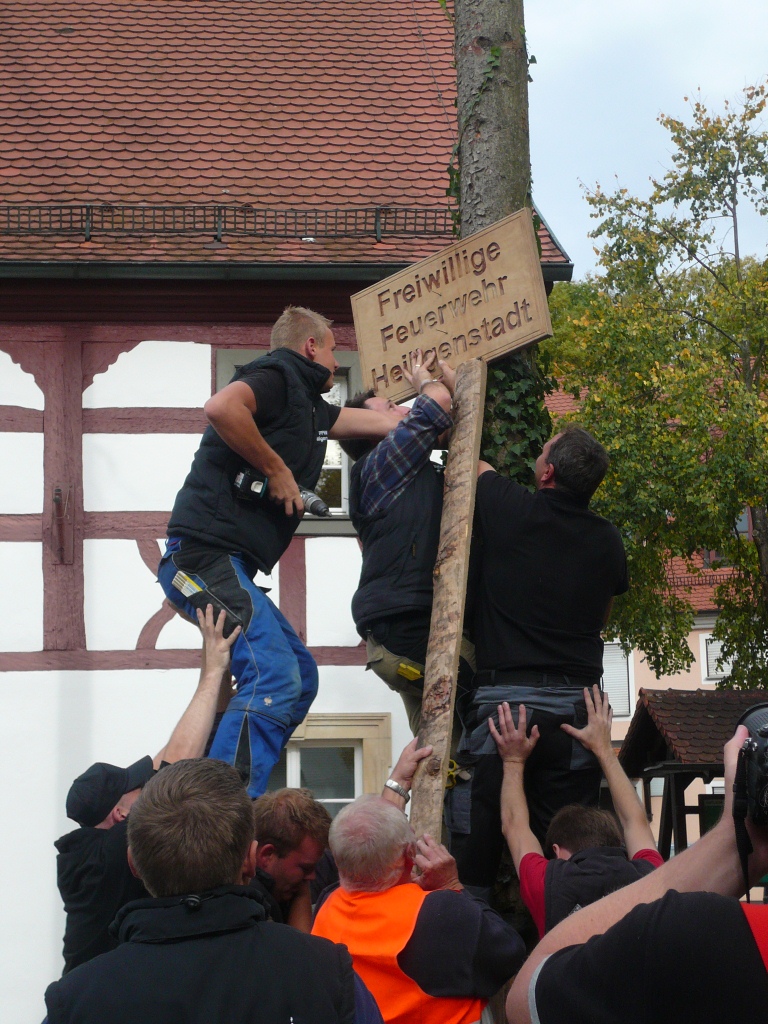 Traditionsgemäß stellte die FF Heiligenstadt auch in diesem Jahr wieder den Kerwa-Baum auf. Während "die Männer" den Baum holten, banden "die Frauen" den Kranz. Der Kranz wird "angepasst". Die Schleifen müssen auch vorbereitet werden. Wenigstens kann man sich dazu setzen :-) Sieht schon recht gut aus. Die Spitze wird auch schon.... Gleich geht's los - und die Jüngsten dürfen mit dabei sein (Nachwuchsgewinnung und -förderung :-) ) Helmut, wenn Du Deine Hände suchst,.... Und jetzt setzt sich der Zug in Bewegung - für die lange Marschstrecke und den beschwerlichen Weg sowie für die kräftezehrende Arbeit wurde extra ein Verpflegungsgefährt beschafft! Mit Musik geht es besser! Die Hauptstrasse ist erreicht. Und nun der Schwenk zum Marktplatz Der Marktplatz ist erreicht - und der Fahrer muss sich nun voll konzentrieren, damit er sein Gefährt an die richtige Stelle bringt. Eine letzte Stärkung, bevor das Aufstellen beginnt ... und die Musik spielt dazu Bewundernde Blicke für die Kameraden, die den Baum aufstellen ;-) Eine wichtige Aufgabe: den Baum genau in das "Loch" zu postieren - unser Bürgermeister höchstpersönlich überwcht dies. Was will uns dieser Gesichtsausdruck sagen? So langsam geht's aufwärts. Rainer hat das Kommando Mach mal ein schönes Gesicht Geht doch Auch das Zuschauen macht hungrig Passt's vorne? Ja! Arbeitsteilung: zwei schauen nach oben, zwei nach unten Bald ist es soweit Sieht schon fast gut aus! Und jetzt die Akrobatennummer (Gerüchten zu Folge soll diese akrobatische Leistung ins Sommerprogramm des Zirkus Krone aufgenommen werden - die menschliche Pyramide) Noch ist es kostenlos - im Sommer dann wird EIntritt verlangt! Und dann wurde Kerwa gefeiert - gleich beim Aichinger am Marktplatz Maddin mit seiner Quetsche spielte wieder auf und brachte eine Bombenstimmung in die Gaststube