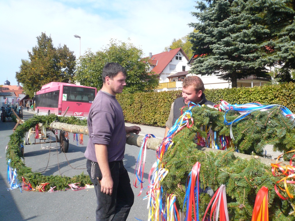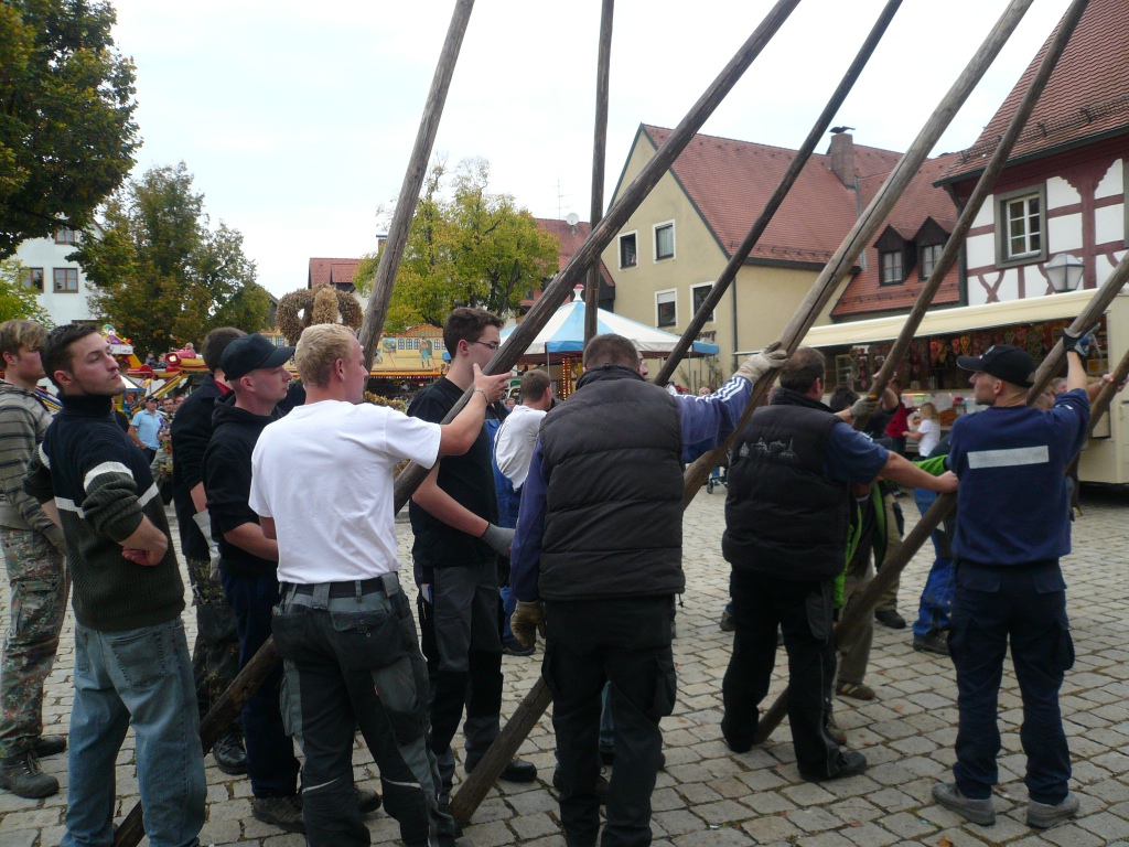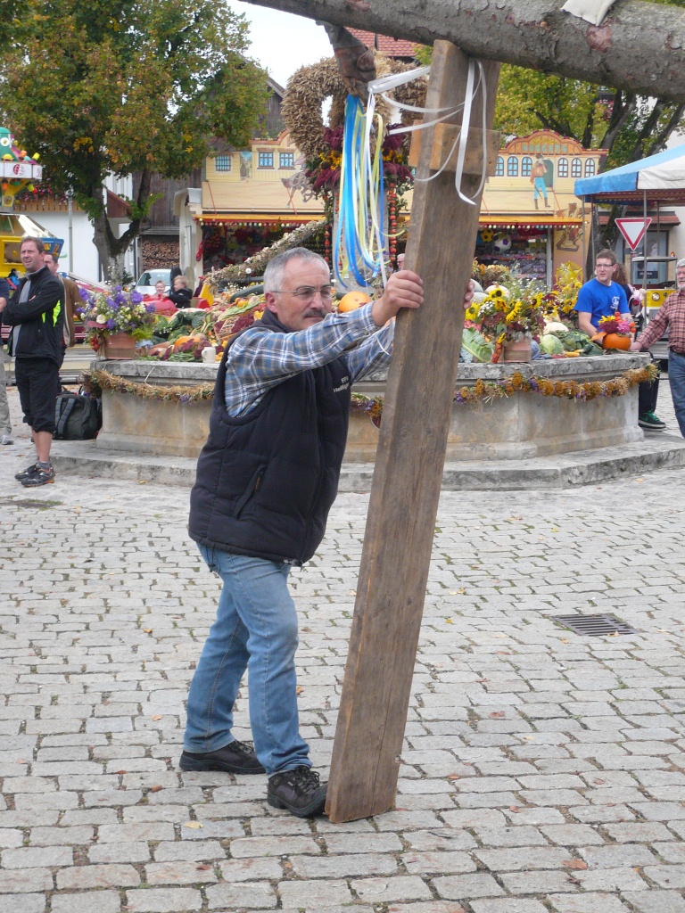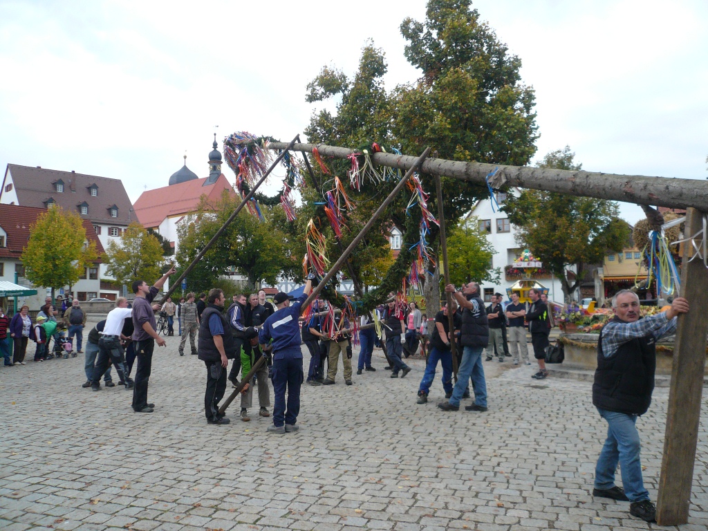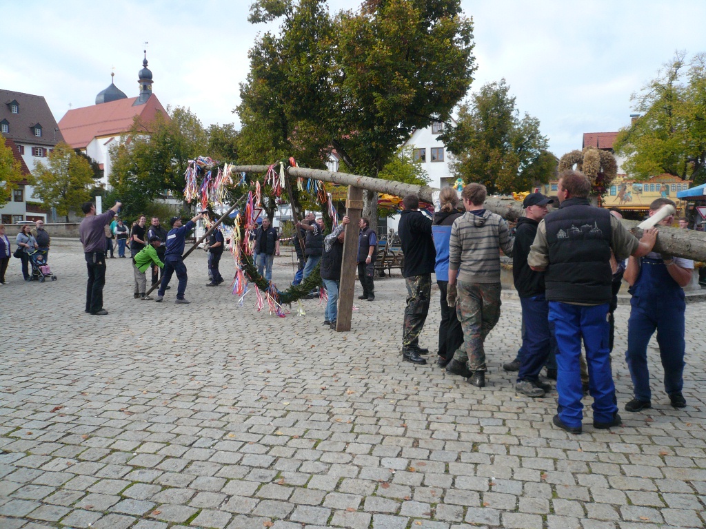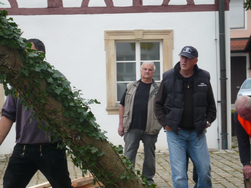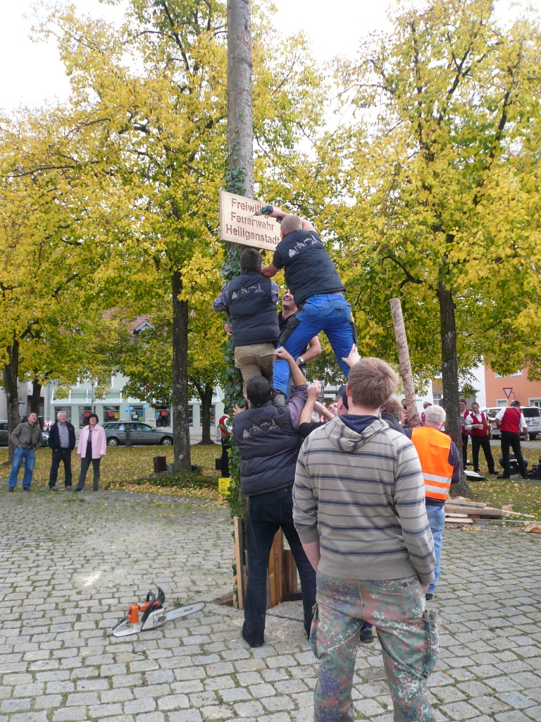 Traditionsgemäß stellte die FF Heiligenstadt auch in diesem Jahr wieder den Kerwa-Baum auf. Während "die Männer" den Baum holten, banden "die Frauen" den Kranz. Der Kranz wird "angepasst". Die Schleifen müssen auch vorbereitet werden. Wenigstens kann man sich dazu setzen :-) Sieht schon recht gut aus. Die Spitze wird auch schon.... Gleich geht's los - und die Jüngsten dürfen mit dabei sein (Nachwuchsgewinnung und -förderung :-) ) Helmut, wenn Du Deine Hände suchst,.... Und jetzt setzt sich der Zug in Bewegung - für die lange Marschstrecke und den beschwerlichen Weg sowie für die kräftezehrende Arbeit wurde extra ein Verpflegungsgefährt beschafft! Mit Musik geht es besser! Die Hauptstrasse ist erreicht. Und nun der Schwenk zum Marktplatz Der Marktplatz ist erreicht - und der Fahrer muss sich nun voll konzentrieren, damit er sein Gefährt an die richtige Stelle bringt. Eine letzte Stärkung, bevor das Aufstellen beginnt ... und die Musik spielt dazu Bewundernde Blicke für die Kameraden, die den Baum aufstellen ;-) Eine wichtige Aufgabe: den Baum genau in das "Loch" zu postieren - unser Bürgermeister höchstpersönlich überwcht dies. Was will uns dieser Gesichtsausdruck sagen? So langsam geht's aufwärts. Rainer hat das Kommando Mach mal ein schönes Gesicht Geht doch Auch das Zuschauen macht hungrig Passt's vorne? Ja! Arbeitsteilung: zwei schauen nach oben, zwei nach unten Bald ist es soweit Sieht schon fast gut aus! Und jetzt die Akrobatennummer (Gerüchten zu Folge soll diese akrobatische Leistung ins Sommerprogramm des Zirkus Krone aufgenommen werden - die menschliche Pyramide) Noch ist es kostenlos - im Sommer dann wird EIntritt verlangt! Und dann wurde Kerwa gefeiert - gleich beim Aichinger am Marktplatz Maddin mit seiner Quetsche spielte wieder auf und brachte eine Bombenstimmung in die Gaststube