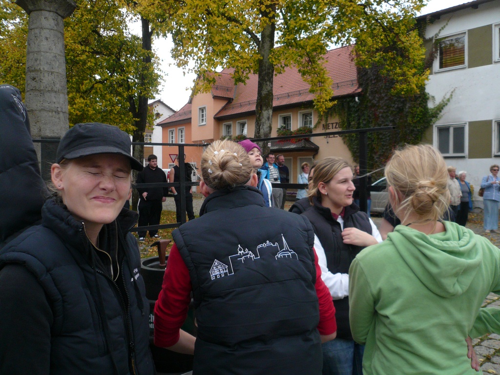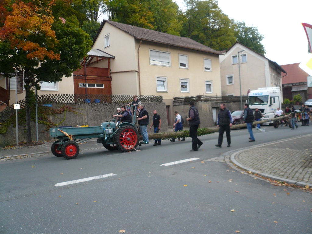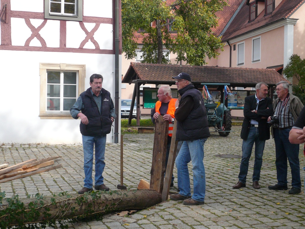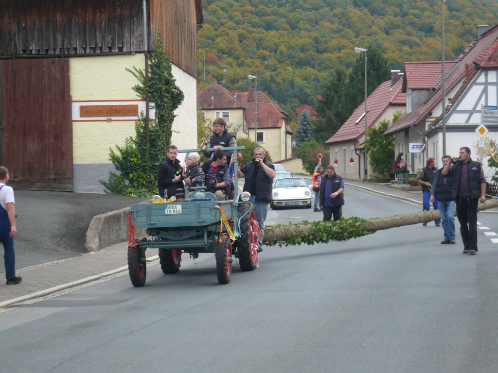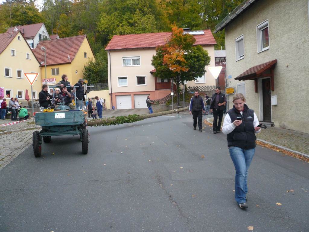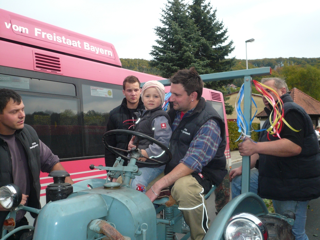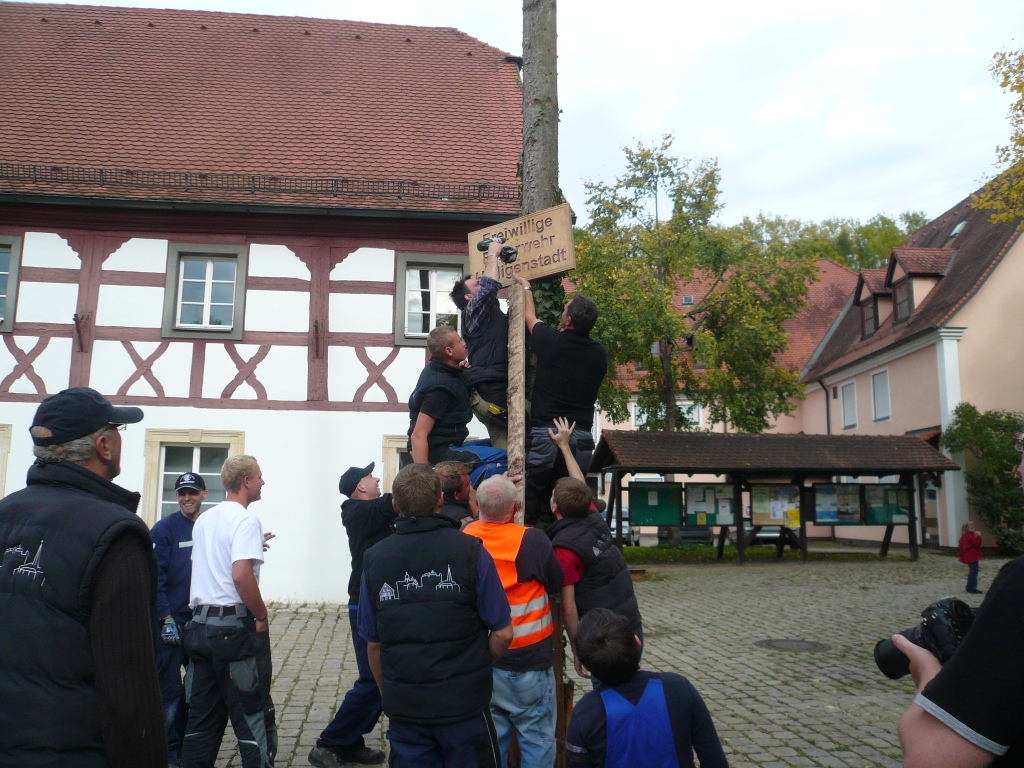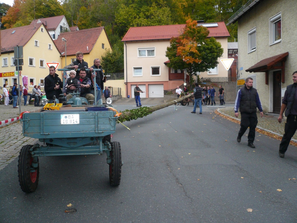 Traditionsgemäß stellte die FF Heiligenstadt auch in diesem Jahr wieder den Kerwa-Baum auf. Während "die Männer" den Baum holten, banden "die Frauen" den Kranz. Der Kranz wird "angepasst". Die Schleifen müssen auch vorbereitet werden. Wenigstens kann man sich dazu setzen :-) Sieht schon recht gut aus. Die Spitze wird auch schon.... Gleich geht's los - und die Jüngsten dürfen mit dabei sein (Nachwuchsgewinnung und -förderung :-) ) Helmut, wenn Du Deine Hände suchst,.... Und jetzt setzt sich der Zug in Bewegung - für die lange Marschstrecke und den beschwerlichen Weg sowie für die kräftezehrende Arbeit wurde extra ein Verpflegungsgefährt beschafft! Mit Musik geht es besser! Die Hauptstrasse ist erreicht. Und nun der Schwenk zum Marktplatz Der Marktplatz ist erreicht - und der Fahrer muss sich nun voll konzentrieren, damit er sein Gefährt an die richtige Stelle bringt. Eine letzte Stärkung, bevor das Aufstellen beginnt ... und die Musik spielt dazu Bewundernde Blicke für die Kameraden, die den Baum aufstellen ;-) Eine wichtige Aufgabe: den Baum genau in das "Loch" zu postieren - unser Bürgermeister höchstpersönlich überwcht dies. Was will uns dieser Gesichtsausdruck sagen? So langsam geht's aufwärts. Rainer hat das Kommando Mach mal ein schönes Gesicht Geht doch Auch das Zuschauen macht hungrig Passt's vorne? Ja! Arbeitsteilung: zwei schauen nach oben, zwei nach unten Bald ist es soweit Sieht schon fast gut aus! Und jetzt die Akrobatennummer (Gerüchten zu Folge soll diese akrobatische Leistung ins Sommerprogramm des Zirkus Krone aufgenommen werden - die menschliche Pyramide) Noch ist es kostenlos - im Sommer dann wird EIntritt verlangt! Und dann wurde Kerwa gefeiert - gleich beim Aichinger am Marktplatz Maddin mit seiner Quetsche spielte wieder auf und brachte eine Bombenstimmung in die Gaststube
