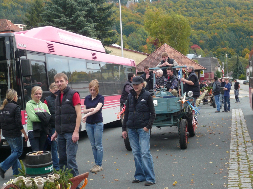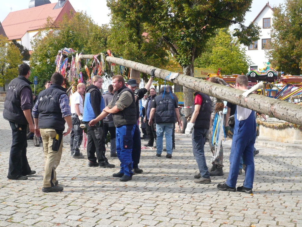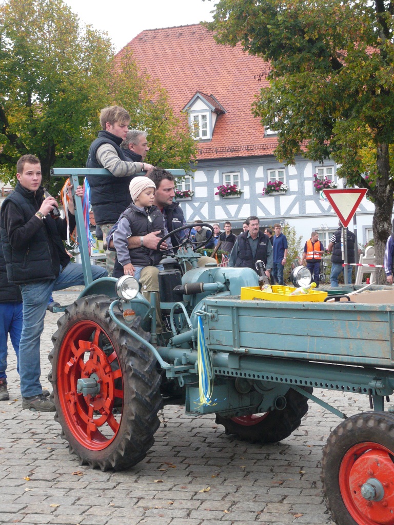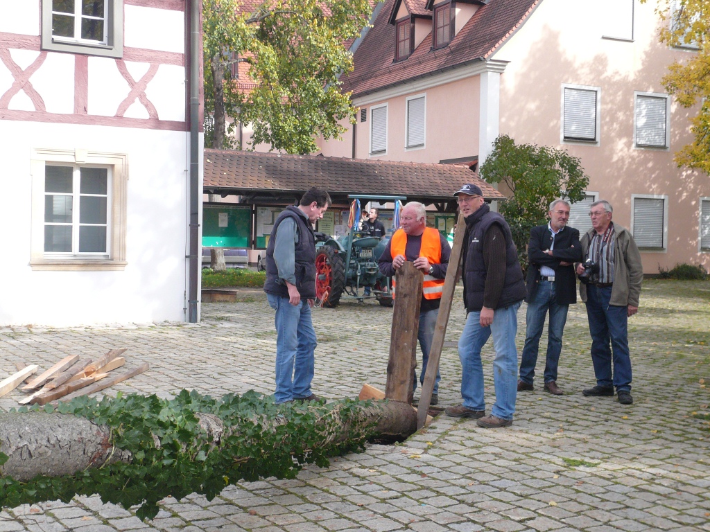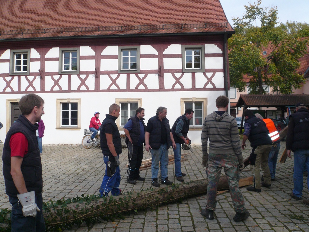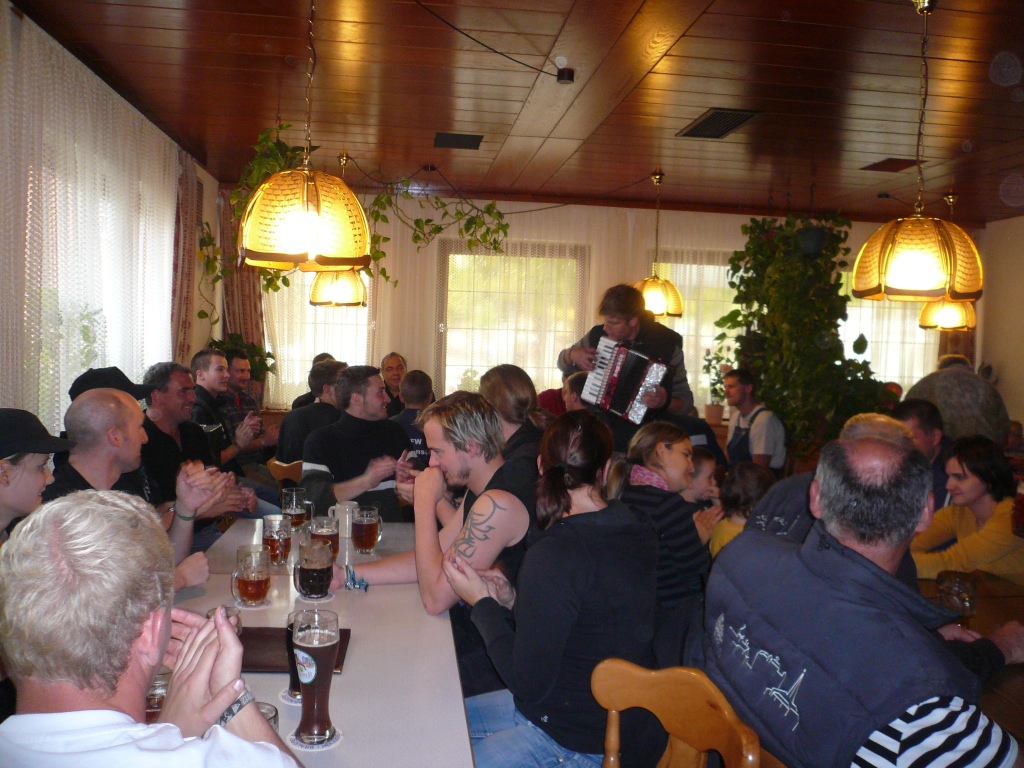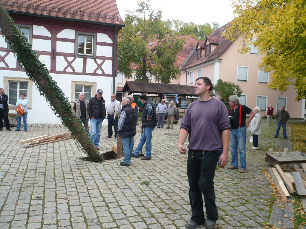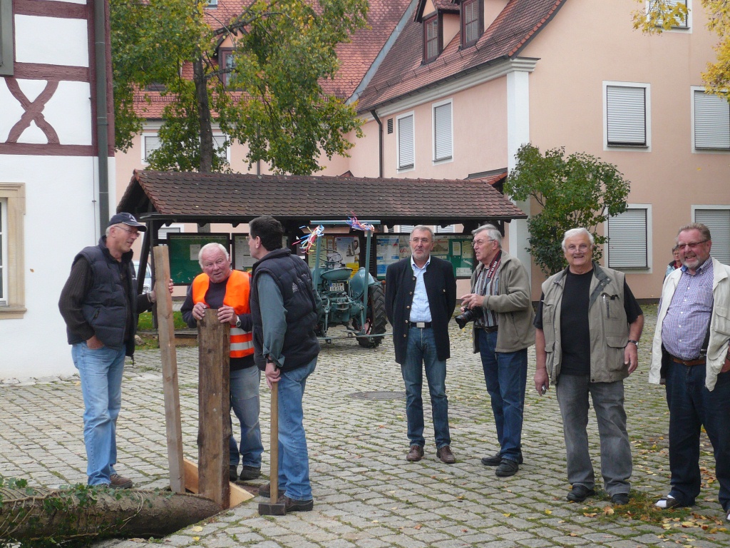 Traditionsgemäß stellte die FF Heiligenstadt auch in diesem Jahr wieder den Kerwa-Baum auf. Während "die Männer" den Baum holten, banden "die Frauen" den Kranz. Der Kranz wird "angepasst". Die Schleifen müssen auch vorbereitet werden. Wenigstens kann man sich dazu setzen :-) Sieht schon recht gut aus. Die Spitze wird auch schon.... Gleich geht's los - und die Jüngsten dürfen mit dabei sein (Nachwuchsgewinnung und -förderung :-) ) Helmut, wenn Du Deine Hände suchst,.... Und jetzt setzt sich der Zug in Bewegung - für die lange Marschstrecke und den beschwerlichen Weg sowie für die kräftezehrende Arbeit wurde extra ein Verpflegungsgefährt beschafft! Mit Musik geht es besser! Die Hauptstrasse ist erreicht. Und nun der Schwenk zum Marktplatz Der Marktplatz ist erreicht - und der Fahrer muss sich nun voll konzentrieren, damit er sein Gefährt an die richtige Stelle bringt. Eine letzte Stärkung, bevor das Aufstellen beginnt ... und die Musik spielt dazu Bewundernde Blicke für die Kameraden, die den Baum aufstellen ;-) Eine wichtige Aufgabe: den Baum genau in das "Loch" zu postieren - unser Bürgermeister höchstpersönlich überwcht dies. Was will uns dieser Gesichtsausdruck sagen? So langsam geht's aufwärts. Rainer hat das Kommando Mach mal ein schönes Gesicht Geht doch Auch das Zuschauen macht hungrig Passt's vorne? Ja! Arbeitsteilung: zwei schauen nach oben, zwei nach unten Bald ist es soweit Sieht schon fast gut aus! Und jetzt die Akrobatennummer (Gerüchten zu Folge soll diese akrobatische Leistung ins Sommerprogramm des Zirkus Krone aufgenommen werden - die menschliche Pyramide) Noch ist es kostenlos - im Sommer dann wird EIntritt verlangt! Und dann wurde Kerwa gefeiert - gleich beim Aichinger am Marktplatz Maddin mit seiner Quetsche spielte wieder auf und brachte eine Bombenstimmung in die Gaststube