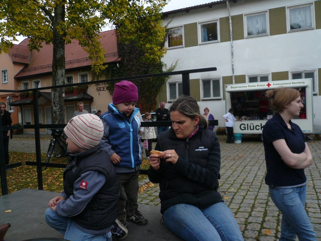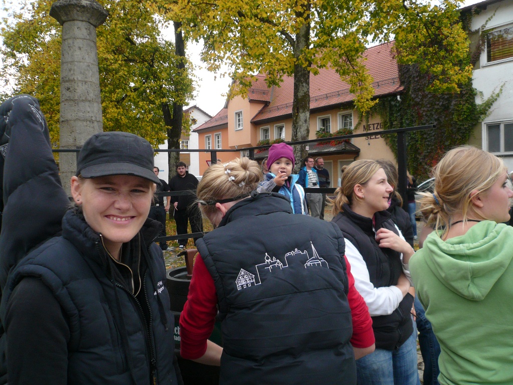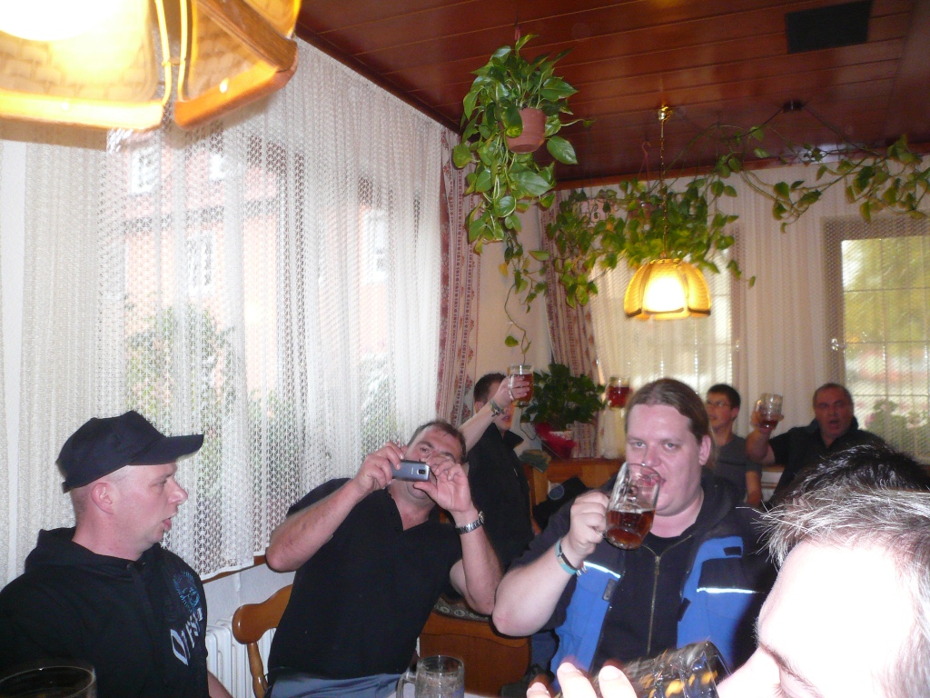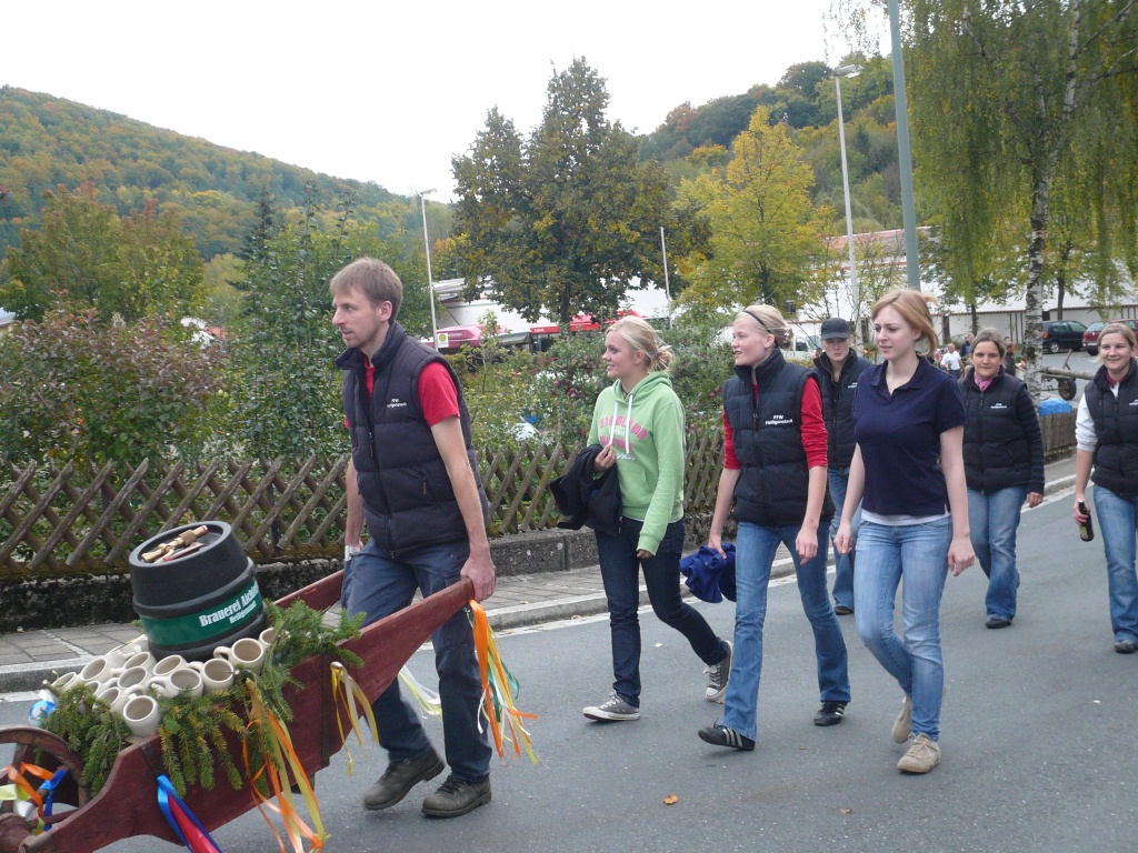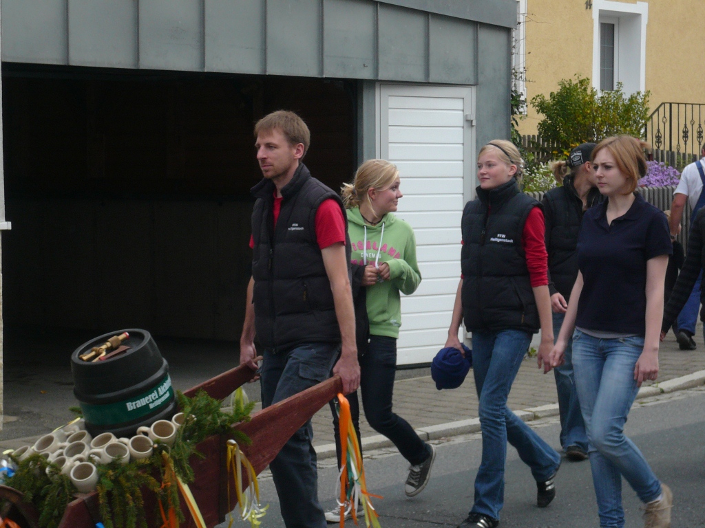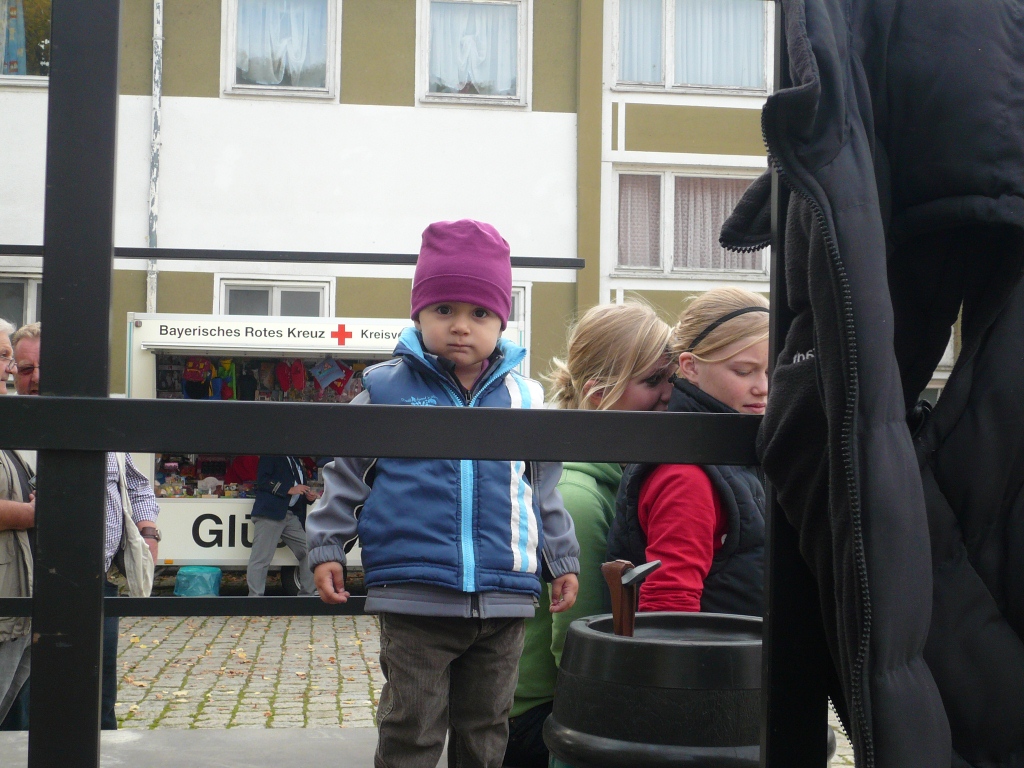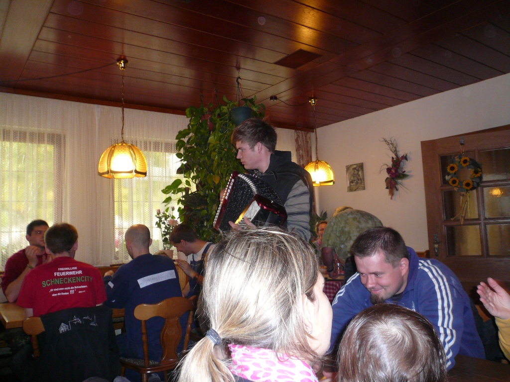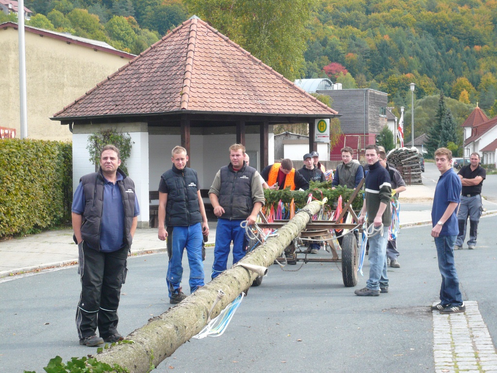 Traditionsgemäß stellte die FF Heiligenstadt auch in diesem Jahr wieder den Kerwa-Baum auf. Während "die Männer" den Baum holten, banden "die Frauen" den Kranz. Der Kranz wird "angepasst". Die Schleifen müssen auch vorbereitet werden. Wenigstens kann man sich dazu setzen :-) Sieht schon recht gut aus. Die Spitze wird auch schon.... Gleich geht's los - und die Jüngsten dürfen mit dabei sein (Nachwuchsgewinnung und -förderung :-) ) Helmut, wenn Du Deine Hände suchst,.... Und jetzt setzt sich der Zug in Bewegung - für die lange Marschstrecke und den beschwerlichen Weg sowie für die kräftezehrende Arbeit wurde extra ein Verpflegungsgefährt beschafft! Mit Musik geht es besser! Die Hauptstrasse ist erreicht. Und nun der Schwenk zum Marktplatz Der Marktplatz ist erreicht - und der Fahrer muss sich nun voll konzentrieren, damit er sein Gefährt an die richtige Stelle bringt. Eine letzte Stärkung, bevor das Aufstellen beginnt ... und die Musik spielt dazu Bewundernde Blicke für die Kameraden, die den Baum aufstellen ;-) Eine wichtige Aufgabe: den Baum genau in das "Loch" zu postieren - unser Bürgermeister höchstpersönlich überwcht dies. Was will uns dieser Gesichtsausdruck sagen? So langsam geht's aufwärts. Rainer hat das Kommando Mach mal ein schönes Gesicht Geht doch Auch das Zuschauen macht hungrig Passt's vorne? Ja! Arbeitsteilung: zwei schauen nach oben, zwei nach unten Bald ist es soweit Sieht schon fast gut aus! Und jetzt die Akrobatennummer (Gerüchten zu Folge soll diese akrobatische Leistung ins Sommerprogramm des Zirkus Krone aufgenommen werden - die menschliche Pyramide) Noch ist es kostenlos - im Sommer dann wird EIntritt verlangt! Und dann wurde Kerwa gefeiert - gleich beim Aichinger am Marktplatz Maddin mit seiner Quetsche spielte wieder auf und brachte eine Bombenstimmung in die Gaststube
