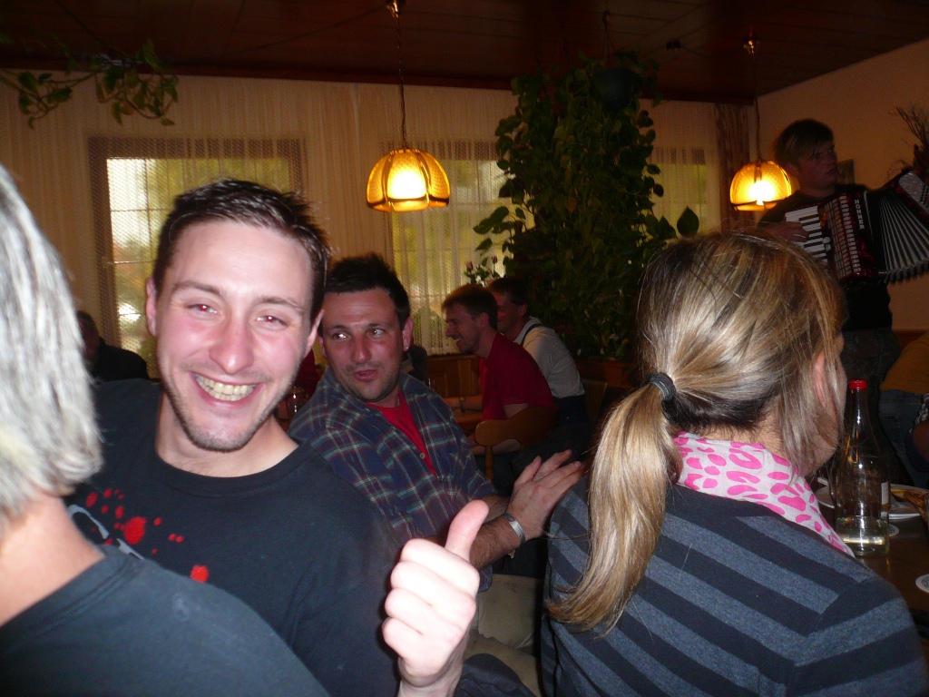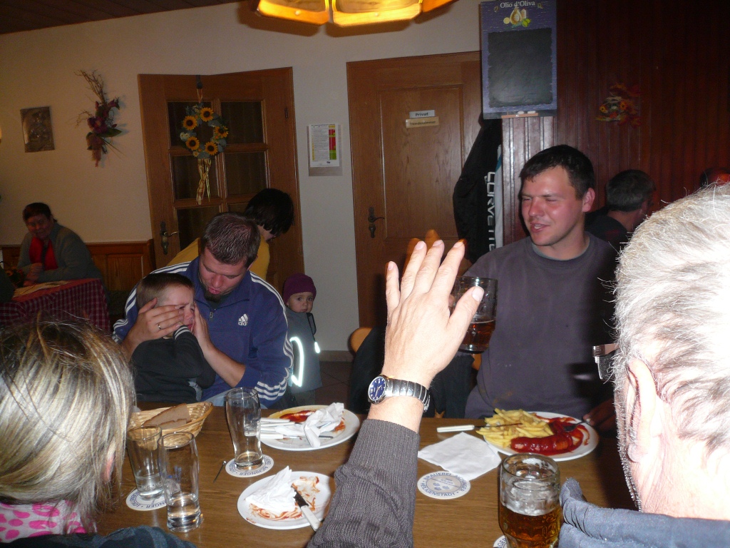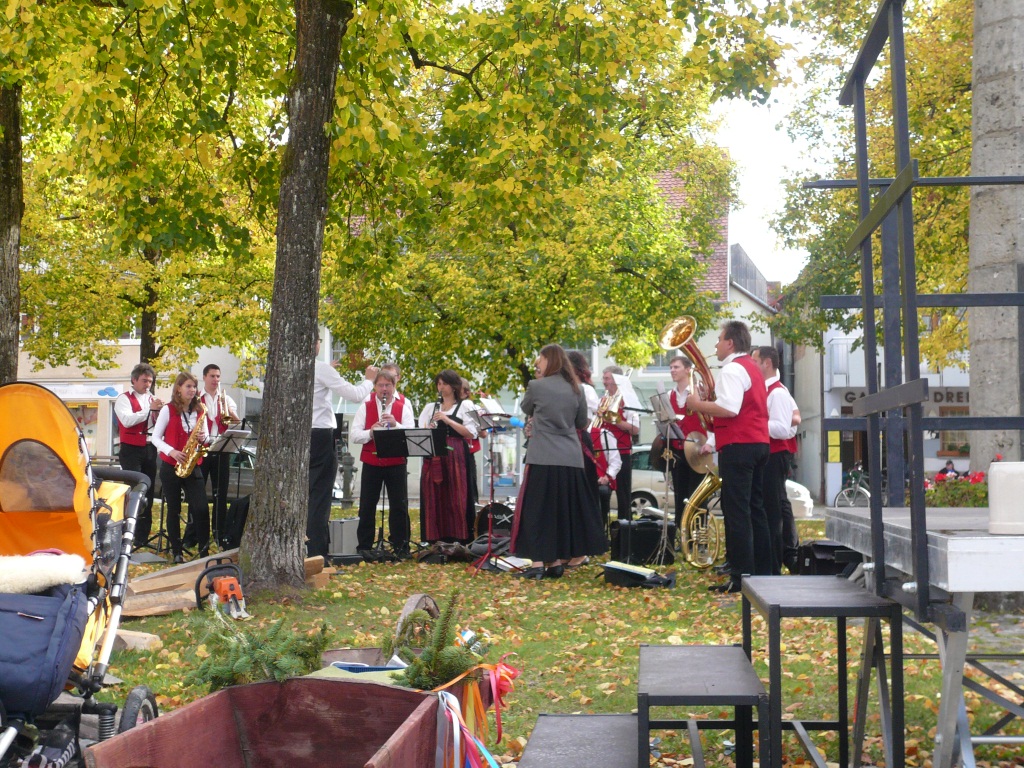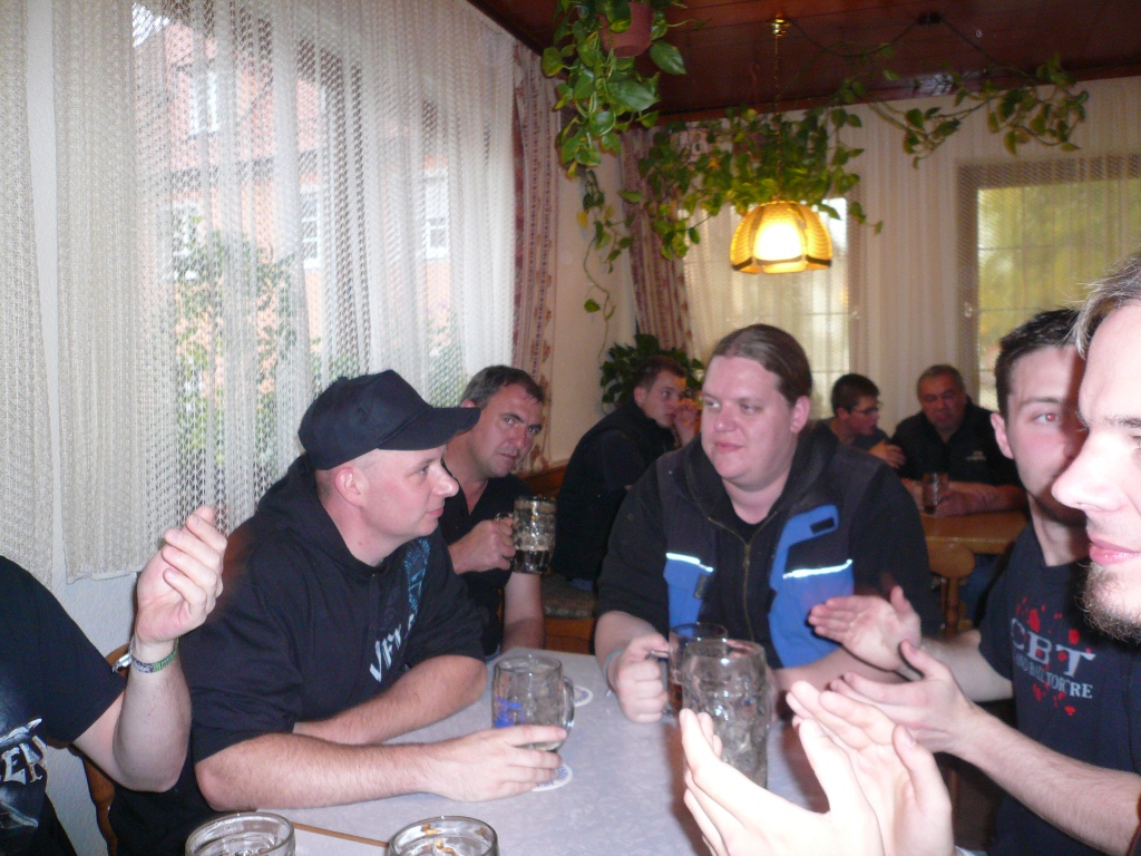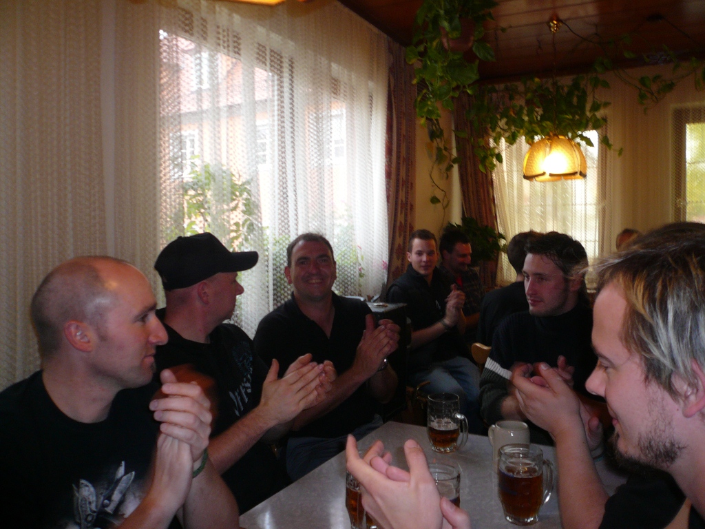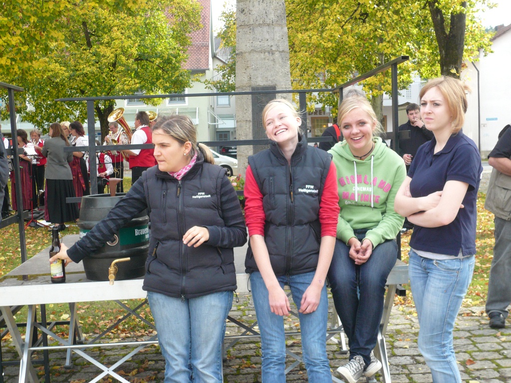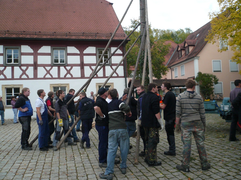 Traditionsgemäß stellte die FF Heiligenstadt auch in diesem Jahr wieder den Kerwa-Baum auf. Während "die Männer" den Baum holten, banden "die Frauen" den Kranz. Der Kranz wird "angepasst". Die Schleifen müssen auch vorbereitet werden. Wenigstens kann man sich dazu setzen :-) Sieht schon recht gut aus. Die Spitze wird auch schon.... Gleich geht's los - und die Jüngsten dürfen mit dabei sein (Nachwuchsgewinnung und -förderung :-) ) Helmut, wenn Du Deine Hände suchst,.... Und jetzt setzt sich der Zug in Bewegung - für die lange Marschstrecke und den beschwerlichen Weg sowie für die kräftezehrende Arbeit wurde extra ein Verpflegungsgefährt beschafft! Mit Musik geht es besser! Die Hauptstrasse ist erreicht. Und nun der Schwenk zum Marktplatz Der Marktplatz ist erreicht - und der Fahrer muss sich nun voll konzentrieren, damit er sein Gefährt an die richtige Stelle bringt. Eine letzte Stärkung, bevor das Aufstellen beginnt ... und die Musik spielt dazu Bewundernde Blicke für die Kameraden, die den Baum aufstellen ;-) Eine wichtige Aufgabe: den Baum genau in das "Loch" zu postieren - unser Bürgermeister höchstpersönlich überwcht dies. Was will uns dieser Gesichtsausdruck sagen? So langsam geht's aufwärts. Rainer hat das Kommando Mach mal ein schönes Gesicht Geht doch Auch das Zuschauen macht hungrig Passt's vorne? Ja! Arbeitsteilung: zwei schauen nach oben, zwei nach unten Bald ist es soweit Sieht schon fast gut aus! Und jetzt die Akrobatennummer (Gerüchten zu Folge soll diese akrobatische Leistung ins Sommerprogramm des Zirkus Krone aufgenommen werden - die menschliche Pyramide) Noch ist es kostenlos - im Sommer dann wird EIntritt verlangt! Und dann wurde Kerwa gefeiert - gleich beim Aichinger am Marktplatz Maddin mit seiner Quetsche spielte wieder auf und brachte eine Bombenstimmung in die Gaststube