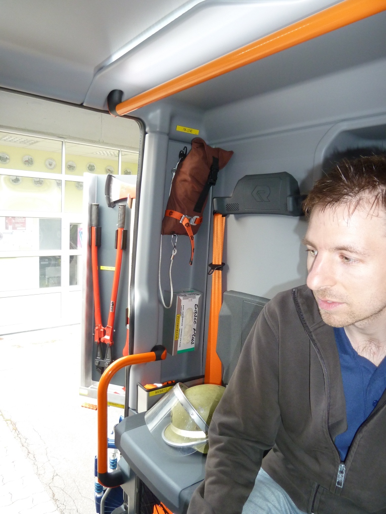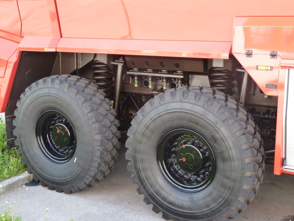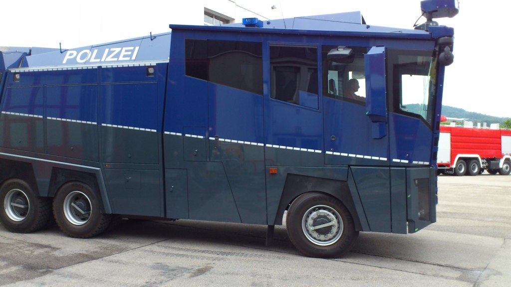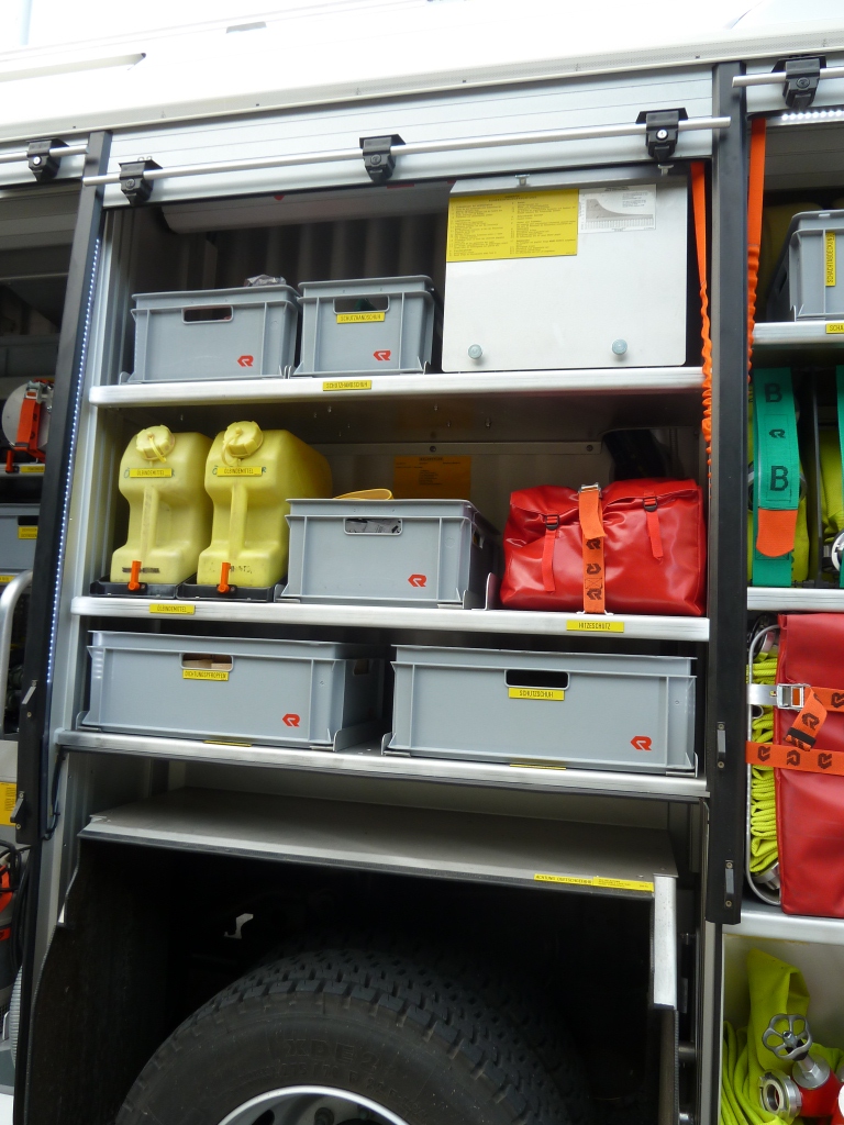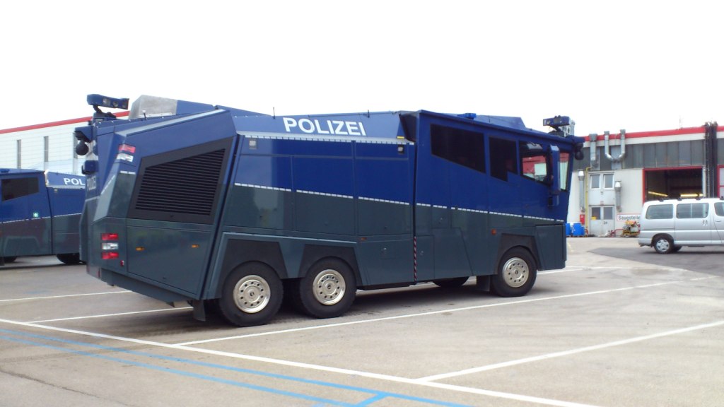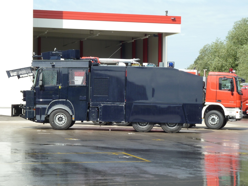 Nun sind wir in der Abholhalle: Christof mit seinem Werkzeug, dem... Der Kommandant angeschnallt im Mannschaftsraum. Beim Mittagessen Und wieder im Freigelände: ein Wasserwerfer der Polizei. Aufbauten, die auf Fahrgestelle warten, ... ... und Fahrgestelle, deren Aufbau noch nicht fertig ist. Unter den weißen Planen befinden sich Fahrgestelle des Panthers. Das heißt Rosenbauer! Der "große" Panther (8x8)