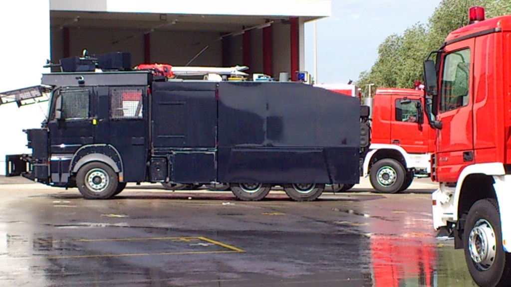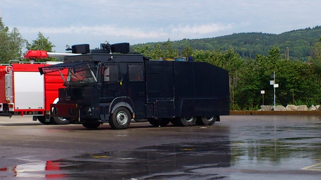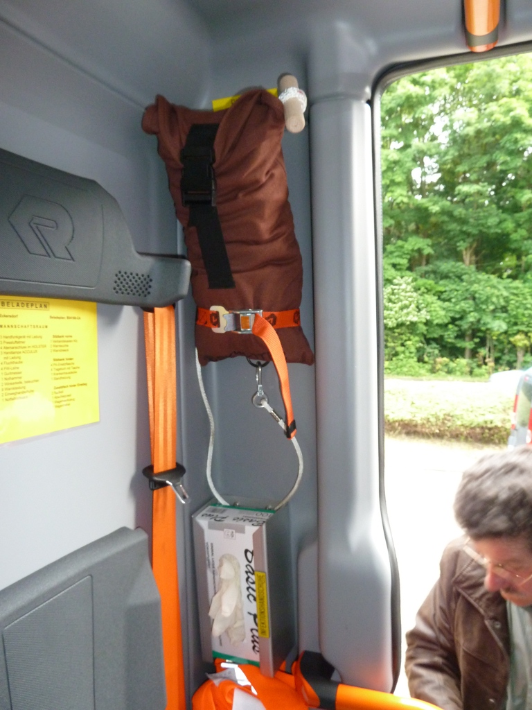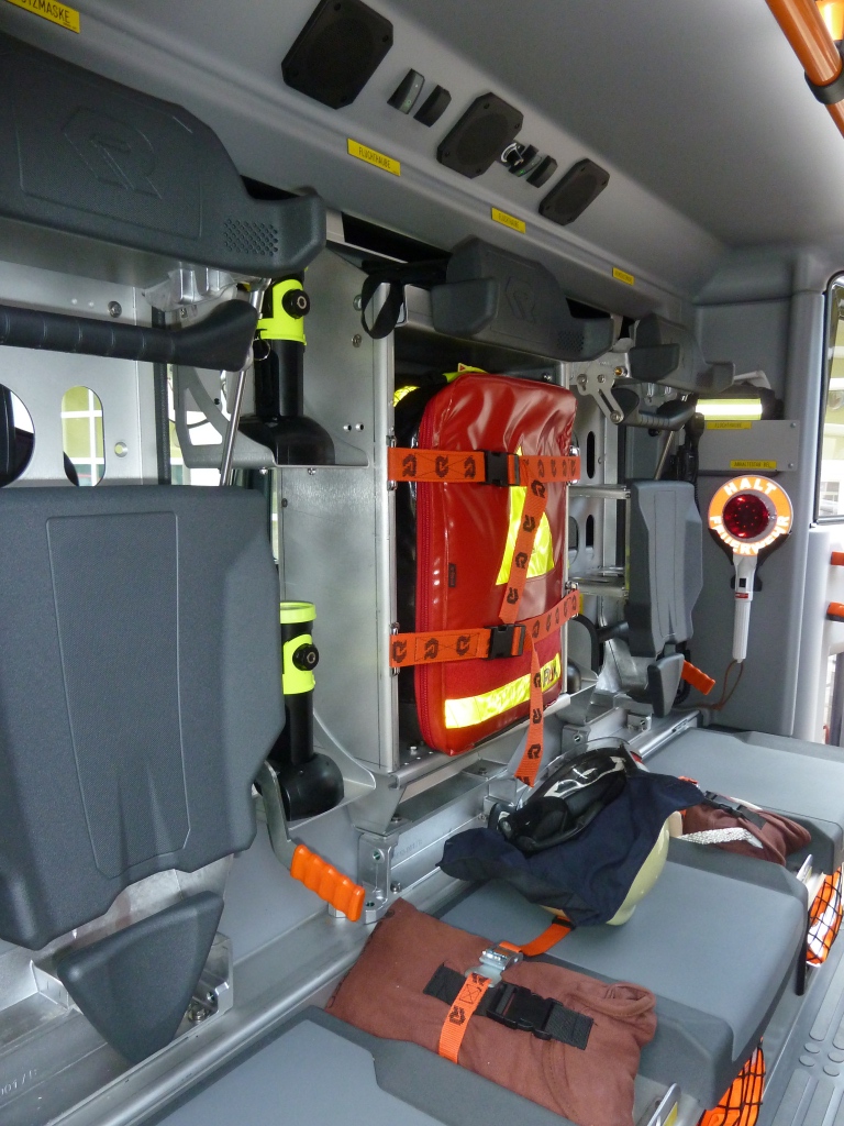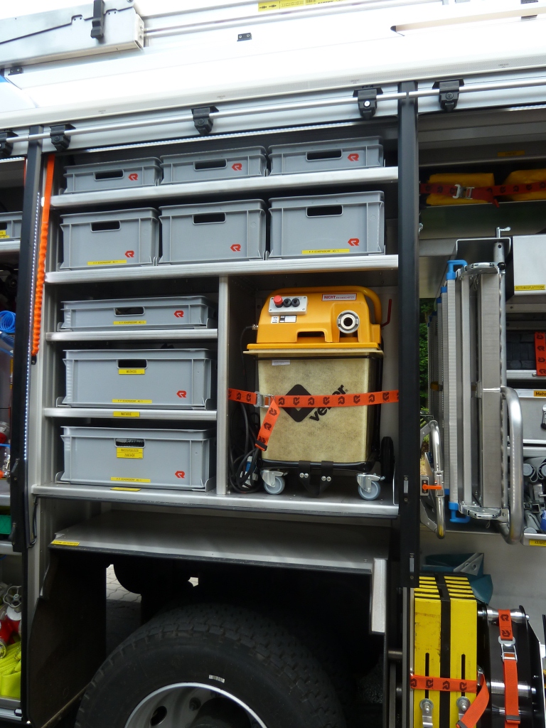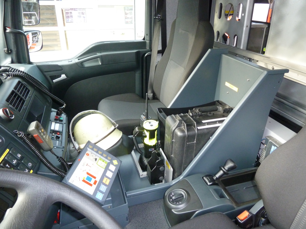 Nun sind wir in der Abholhalle: Christof mit seinem Werkzeug, dem... Der Kommandant angeschnallt im Mannschaftsraum. Beim Mittagessen Und wieder im Freigelände: ein Wasserwerfer der Polizei. Aufbauten, die auf Fahrgestelle warten, ... ... und Fahrgestelle, deren Aufbau noch nicht fertig ist. Unter den weißen Planen befinden sich Fahrgestelle des Panthers. Das heißt Rosenbauer! Der "große" Panther (8x8)