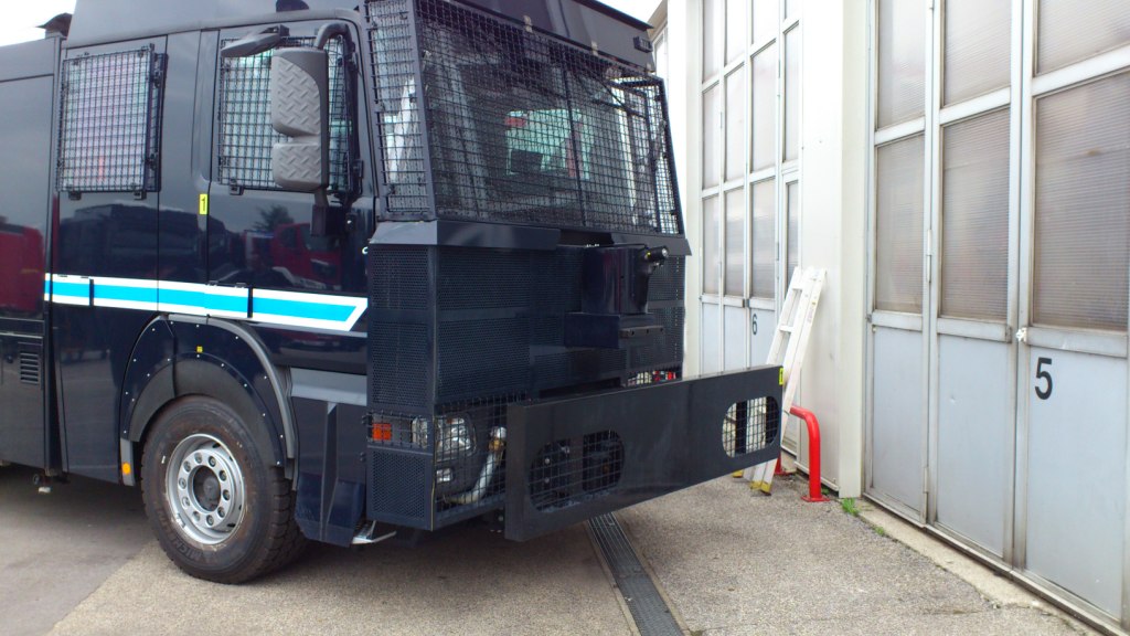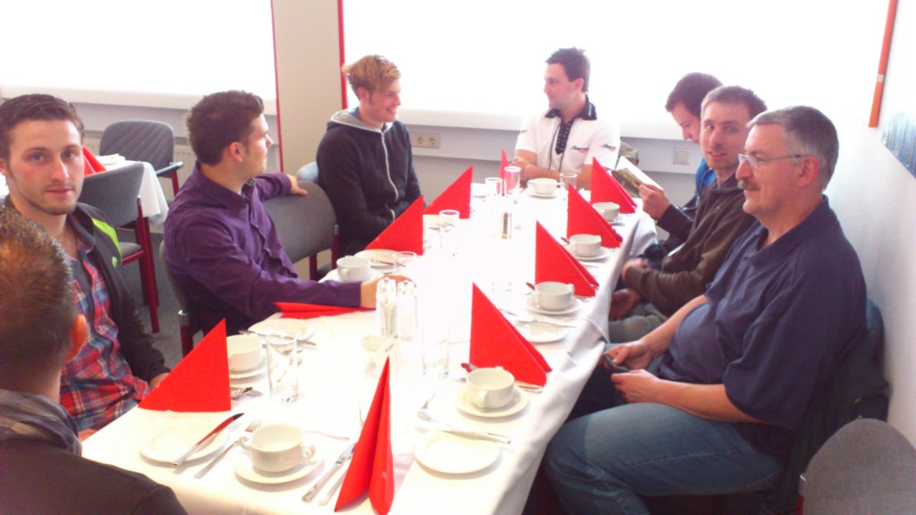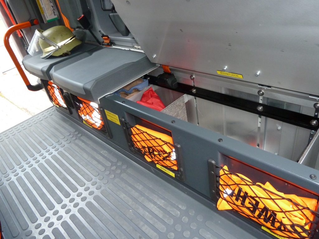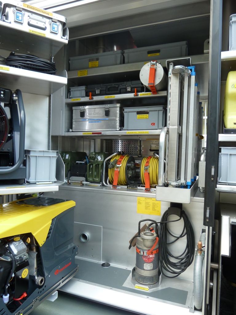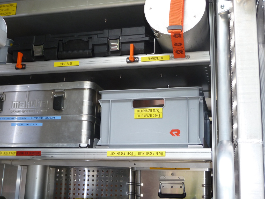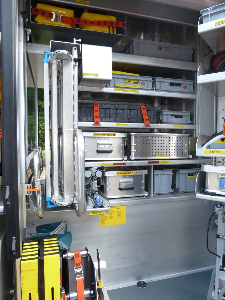 Nun sind wir in der Abholhalle: Christof mit seinem Werkzeug, dem... Der Kommandant angeschnallt im Mannschaftsraum. Beim Mittagessen Und wieder im Freigelände: ein Wasserwerfer der Polizei. Aufbauten, die auf Fahrgestelle warten, ... ... und Fahrgestelle, deren Aufbau noch nicht fertig ist. Unter den weißen Planen befinden sich Fahrgestelle des Panthers. Das heißt Rosenbauer! Der "große" Panther (8x8)
