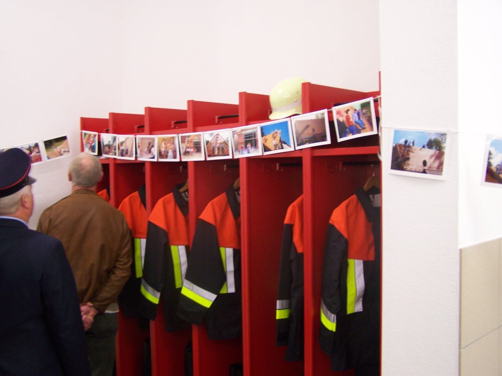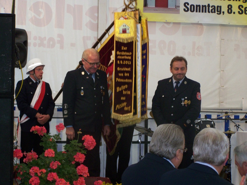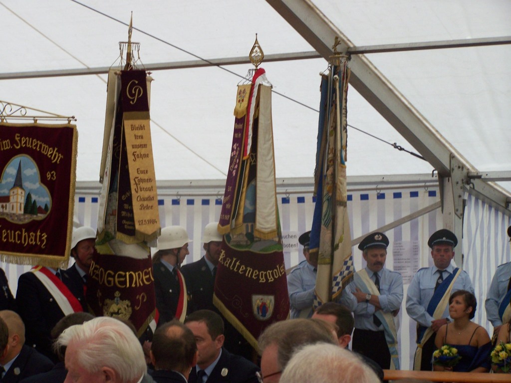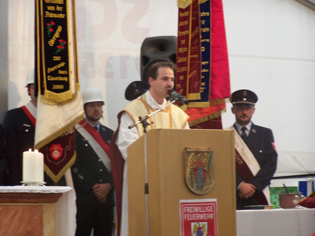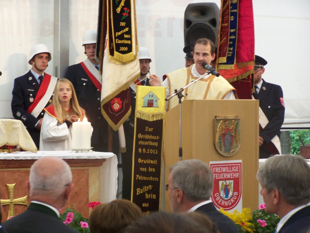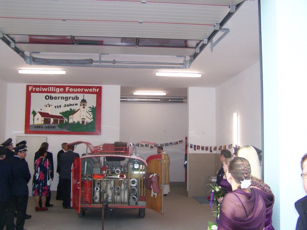 Einige Impressionen: Das alte Gerätehaus: Und nun das neue: An den Wänden waren Bilder mit der "Entstehungsgeschichte" des Hause zu sehen: Im Festzelt, kurz vor demGottesdienst: Beim Festgottesdienst: Die Fahnenabordnungen: Bei der Predigt: Prediger.... ... und Zuhörer Das Fahnenband, gestiftet von den Patenwehren Buttenheim und Mistendorf, wird gesegnet. Die Kommandanten der Patenwehren bringen gemeinsam das Band an der Fahne der FF Oberngrub an. Musikalische Umrahmung des Gottesdienstes. Der Schlusssegen Kurze Hinweise: Das neue Kruzifix wird gesegnet Die Ehrengäste begeben sich zum neuen Gerätehaus - es folgt die kirchliche Segnunhg. Der liturgische Dienst Die Zuschauer Bürgermeister Krämer hängt das Kruzifix auf H.H. Pfarrer Kaiser segnet das Gebäude. Die Kameraden der FF Buttenheim zeigten ihr "Flaggschiff", das HLF 20/16