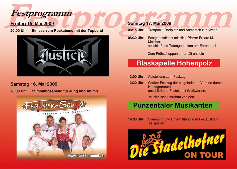 | 15.05.2009 | bis | 125 jähriges Jubiläum (Programm) | FF Herzogenreuth | Herzogenreuth |